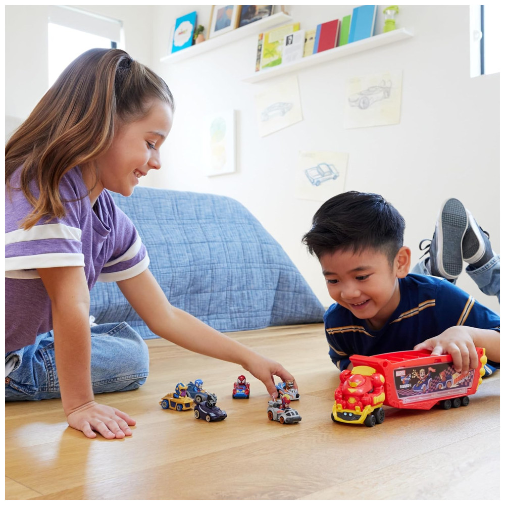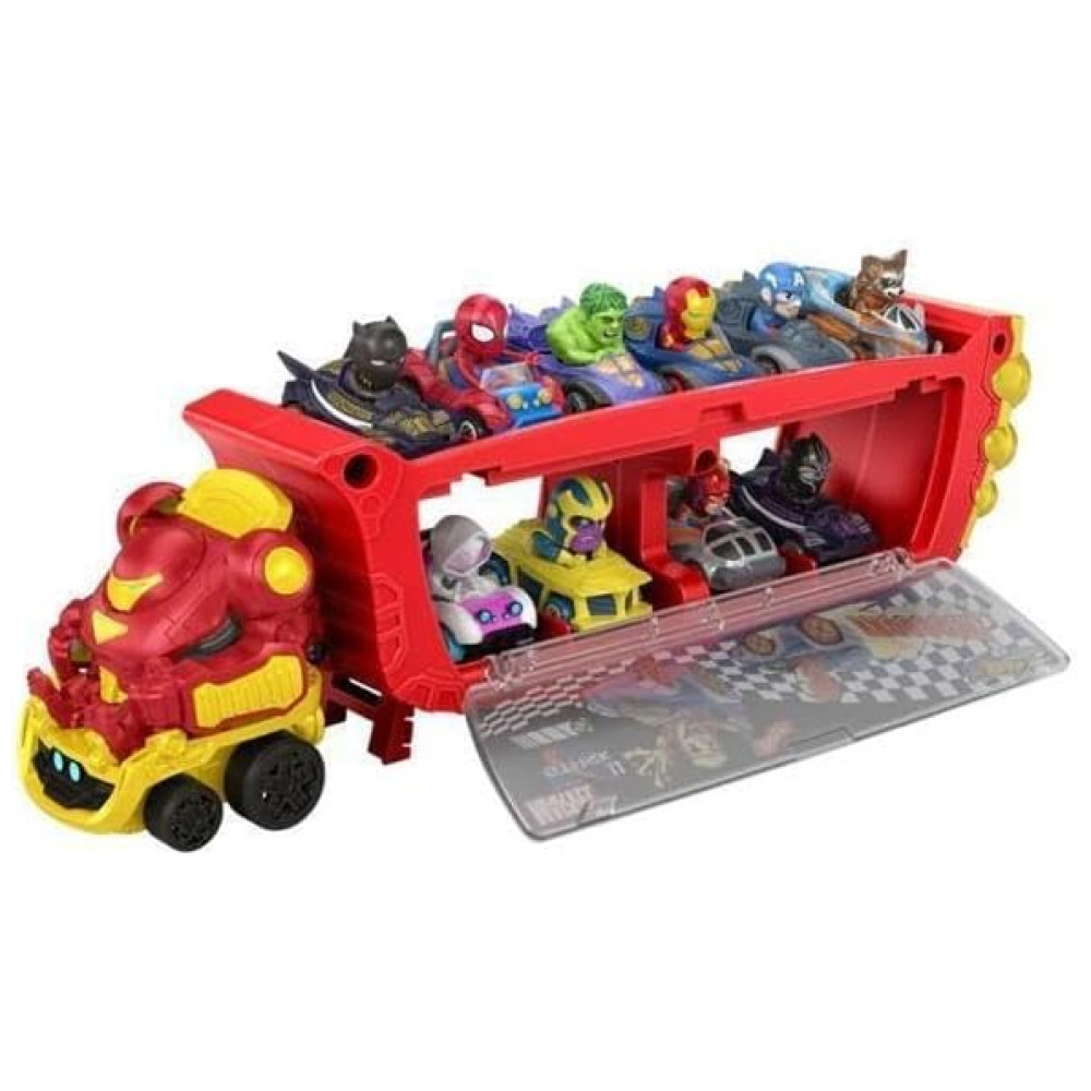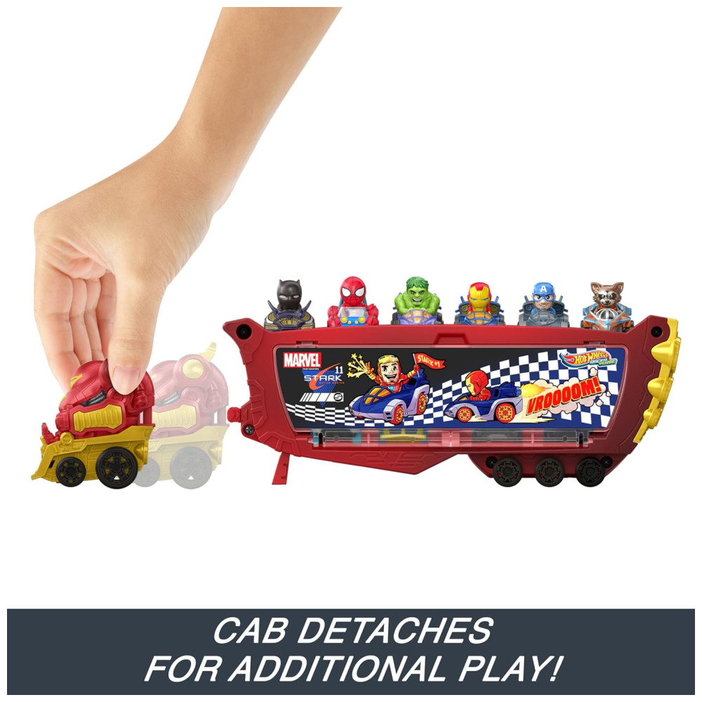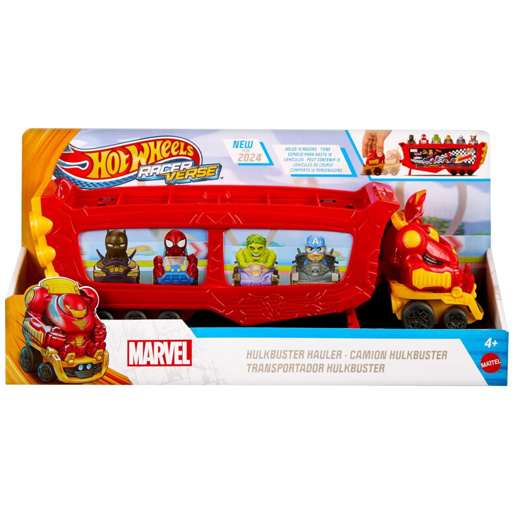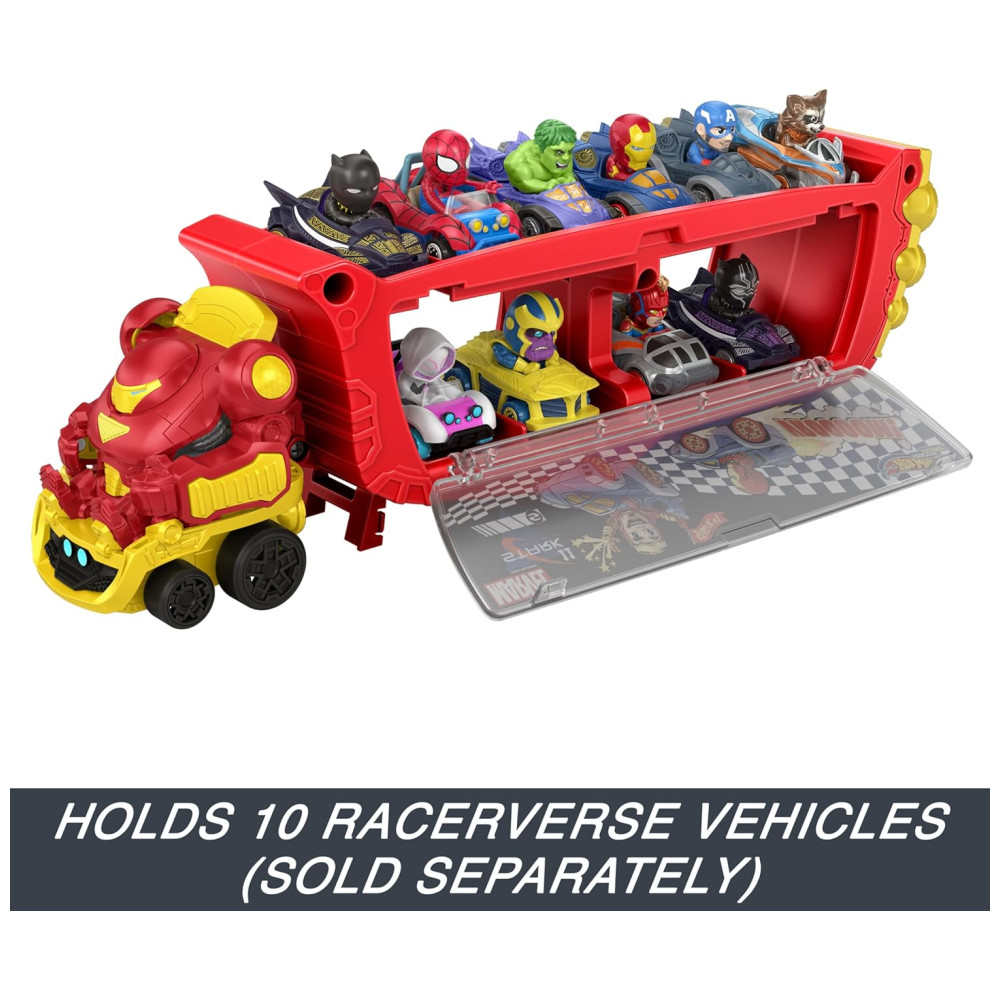 Transportador Hot Wheels RacerVerse Marvel Hulkbuster com Capacidade para 10 Carros Cabine Removível e Capacete Incluso