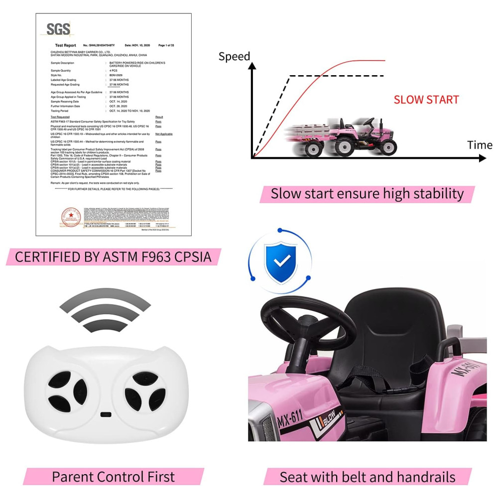 Versão de pneus EVA de 35 W – A versão atualizada do trator tem motor de 35 W, bateria de 7Ah e pneus EVA que são mais potentes e absorventes de choque do que os pneus de banda de rodagem. Leva apenas 20 minutos para montar o carro seguindo o vídeo ou instruções de instalação.