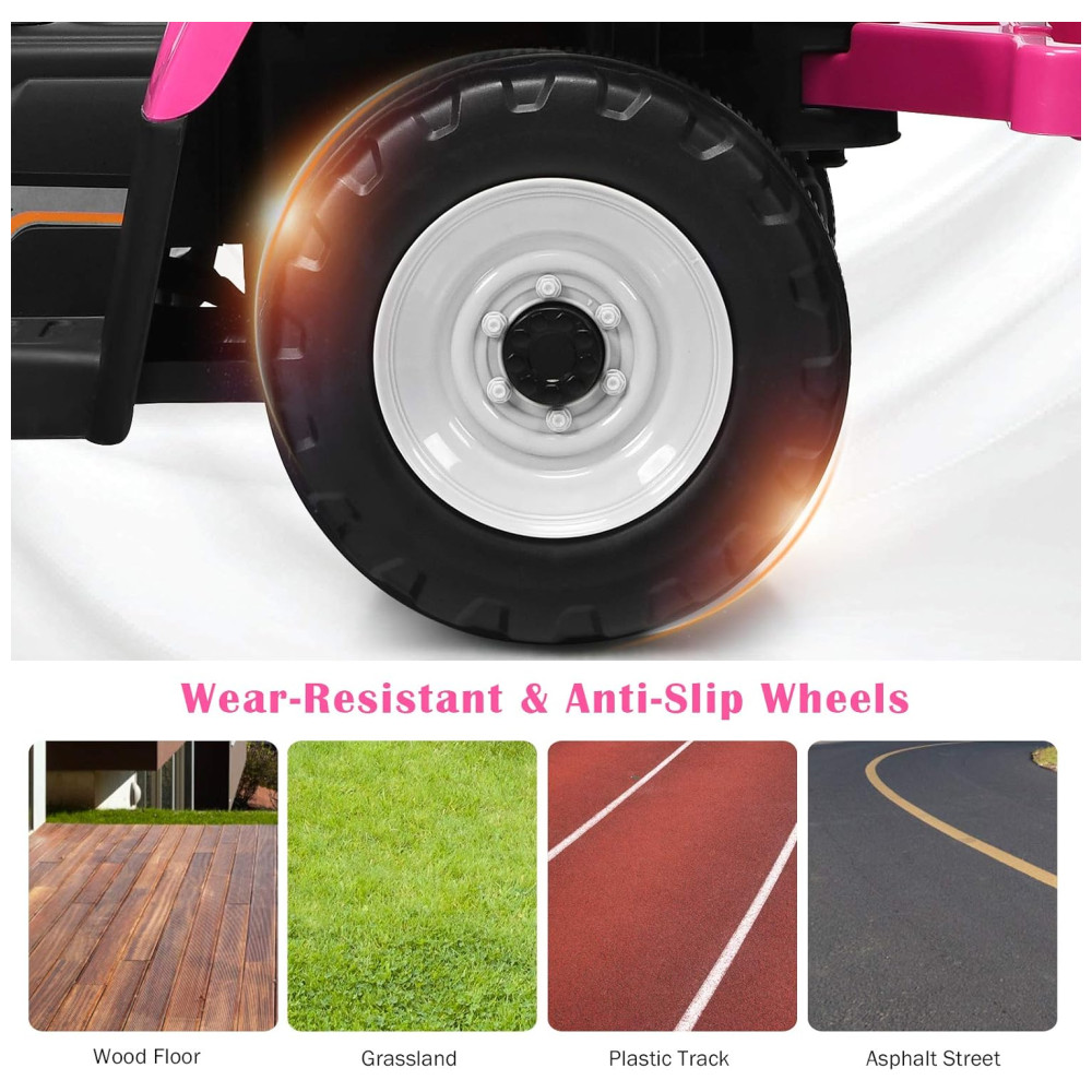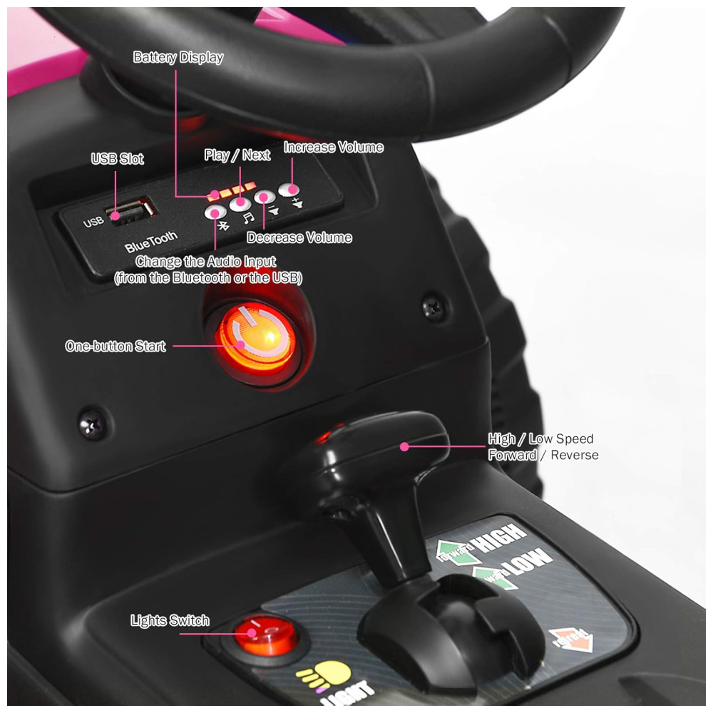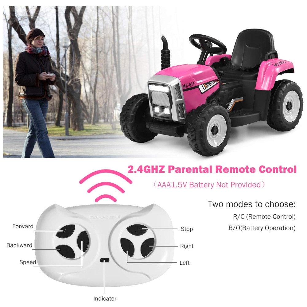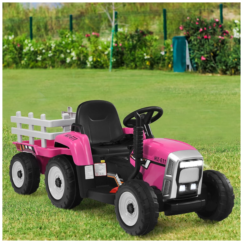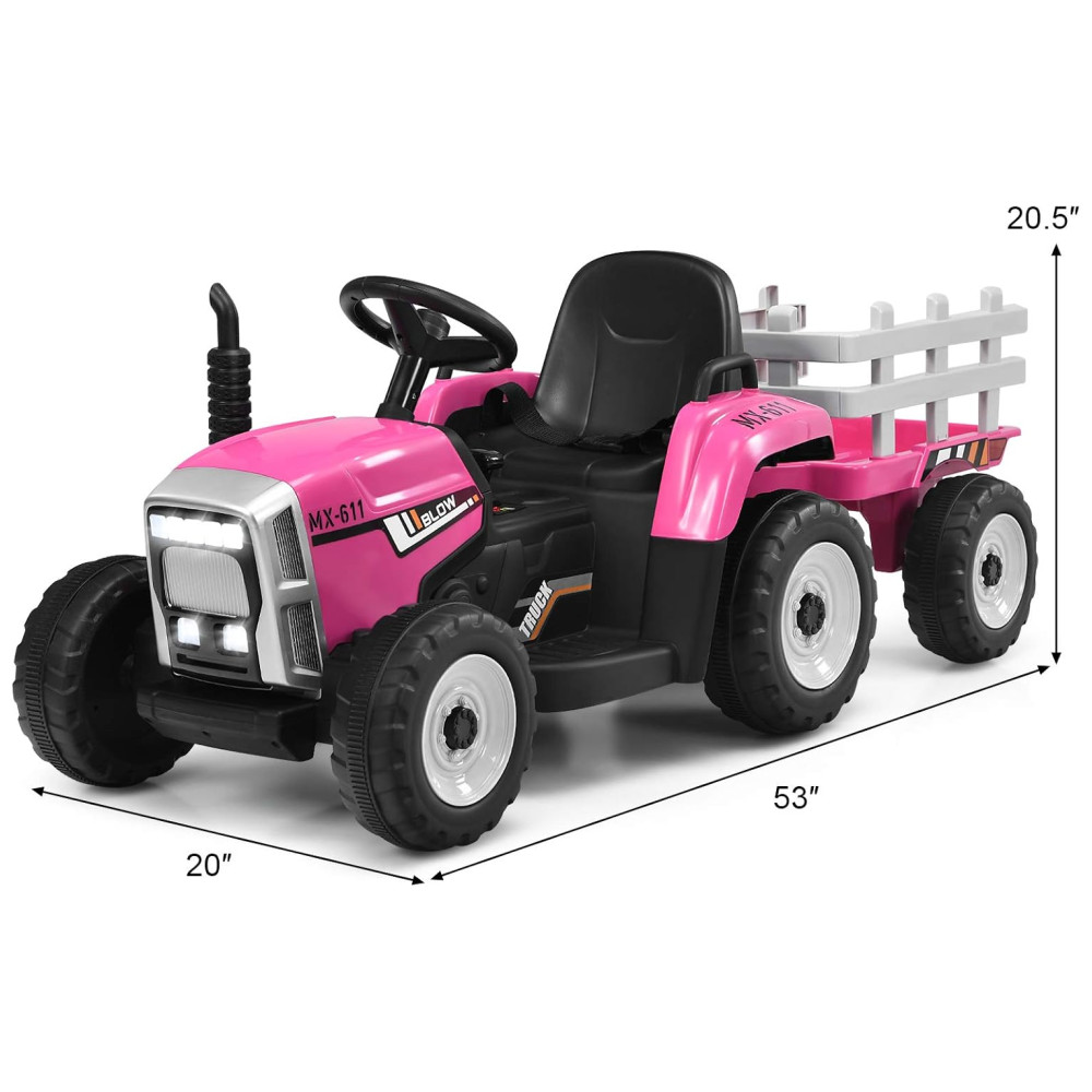 Trator Elétrico Infantil 2 em 1 com Reboque Controle Remoto Câmbio de 3 Marchas Música USB e Bluetooth 12V Olakids Rosa