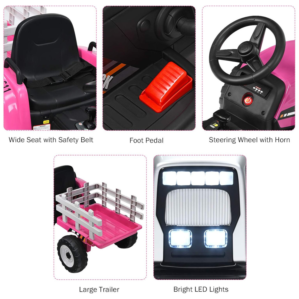 O OLAKIDS 12V kid 2 em 1 é um trator com reboque que proporciona aos seus pequenos um prazer de condução superior e verdadeira diversão. O reboque é removível, sólido e durável, e os faróis LED brilhantes e som de inicialização oferecem um estilo realista.