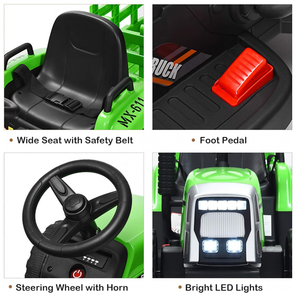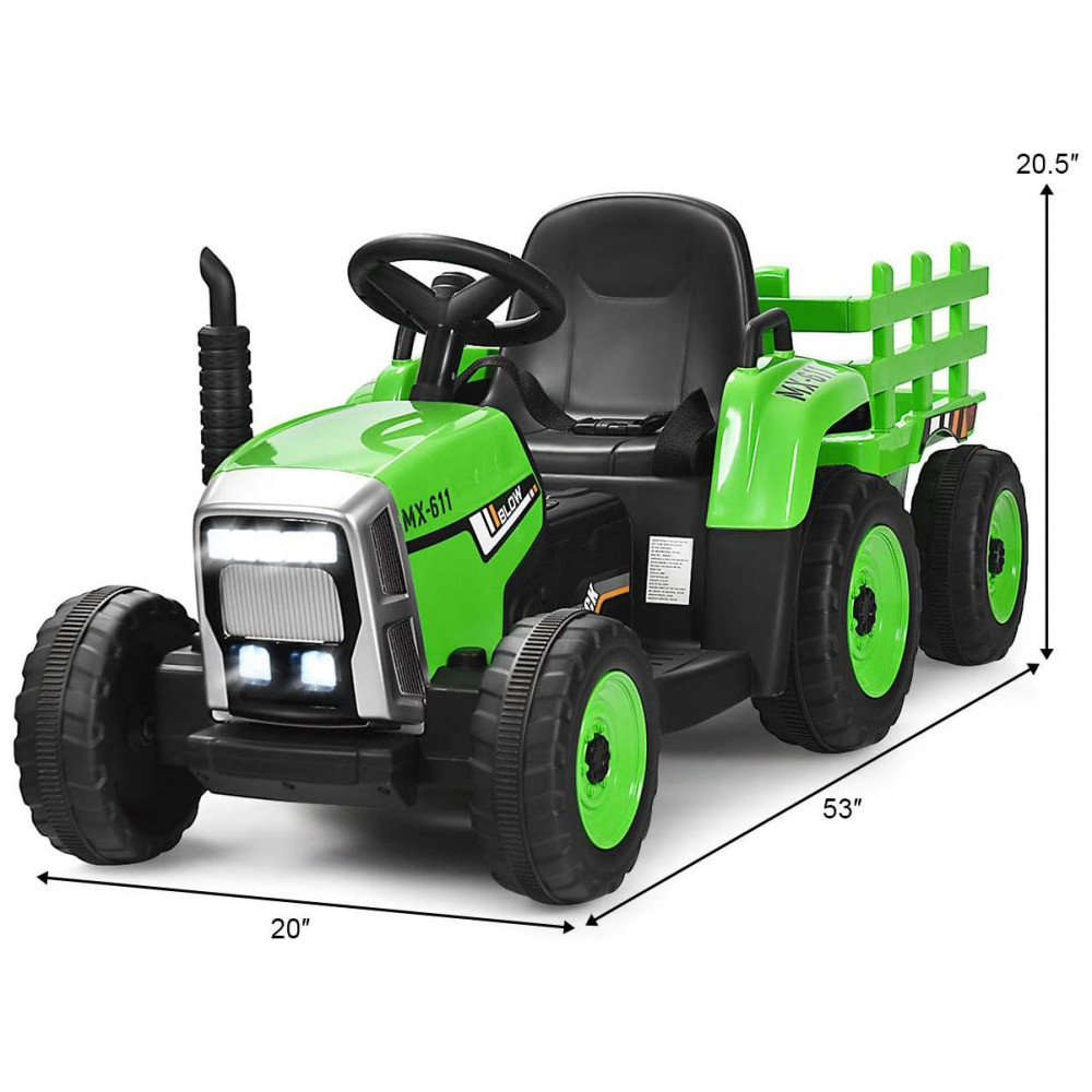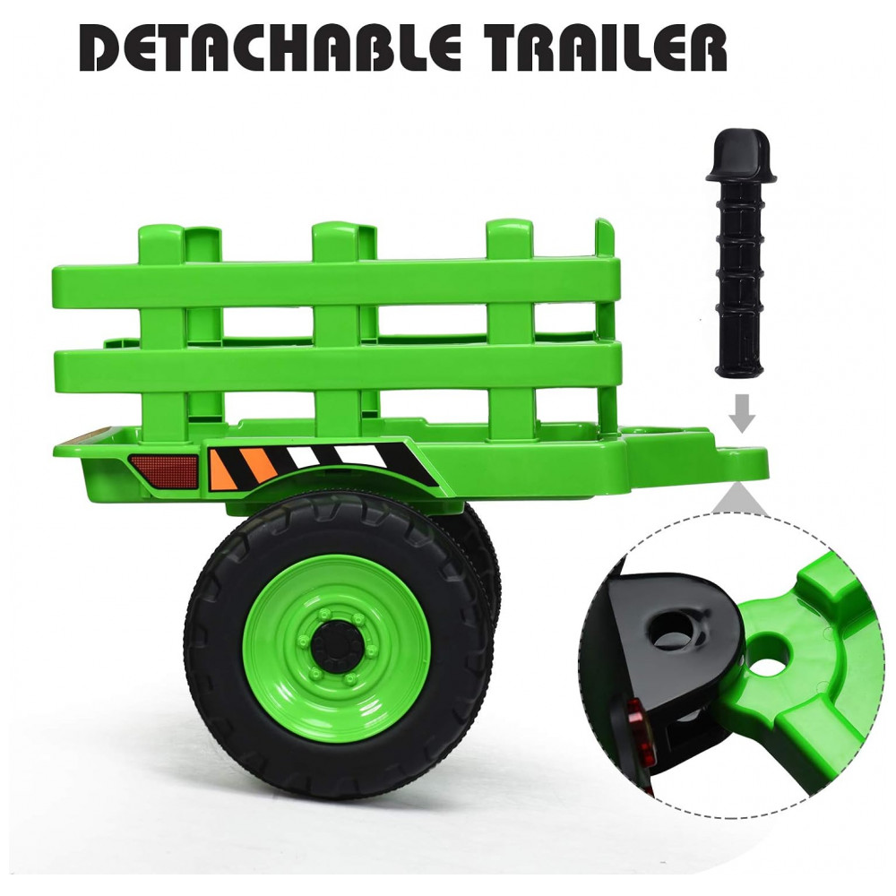 O OLAKIDS 12V kid 2 em 1 é um trator com reboque que proporciona aos seus pequenos um prazer de condução superior e verdadeira diversão. O reboque é removível, sólido e durável, e os faróis LED brilhantes e som de inicialização oferecem um estilo realista.