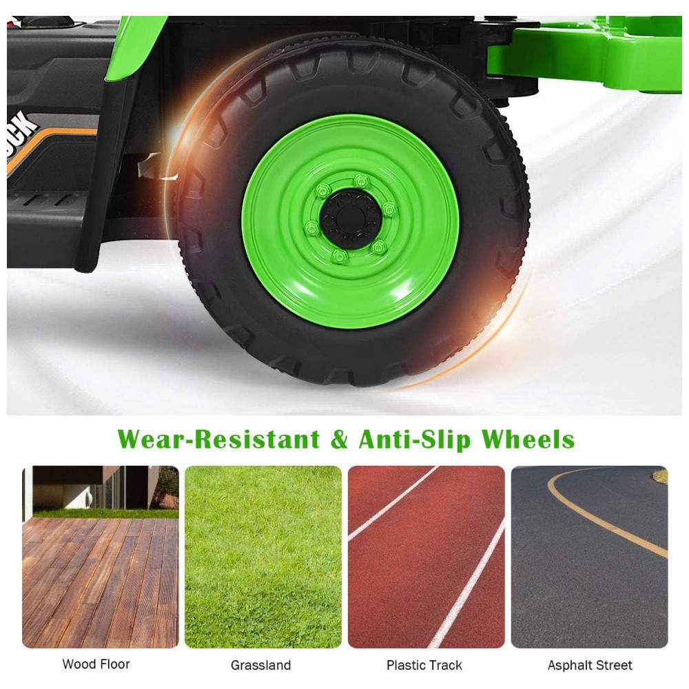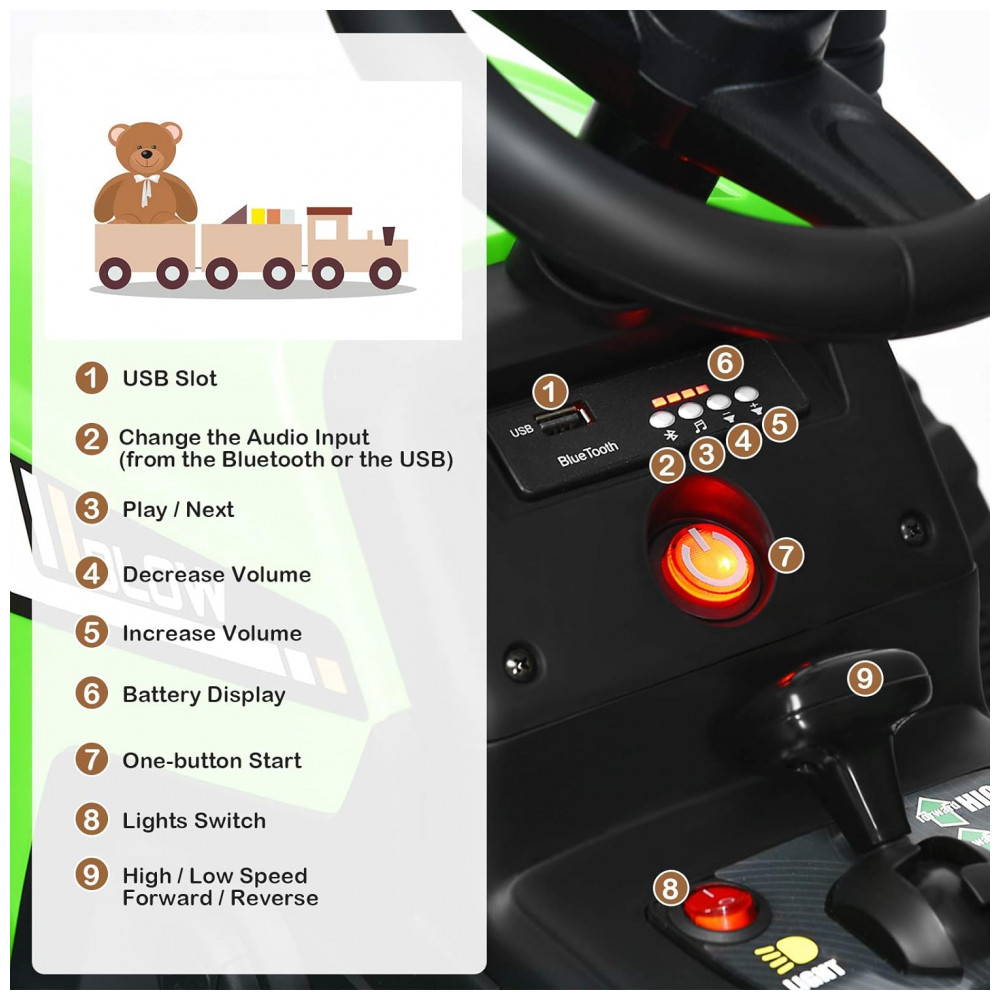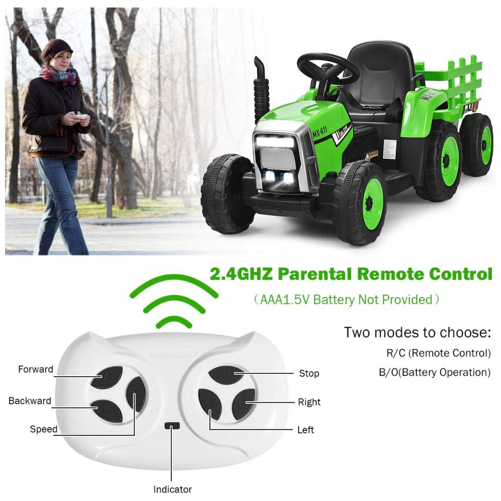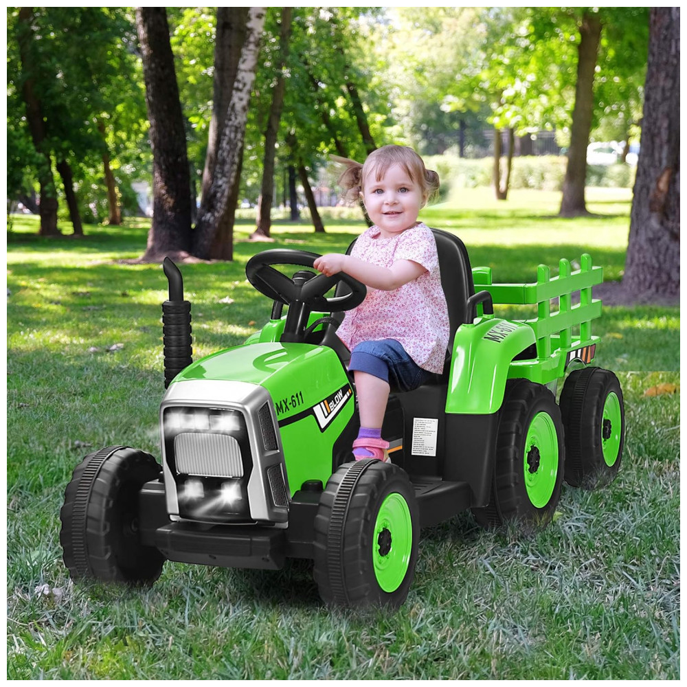 O OLAKIDS 12V kid 2 em 1 é um trator com reboque que proporciona aos seus pequenos um prazer de condução superior e verdadeira diversão. O reboque é removível, sólido e durável, e os faróis LED brilhantes e som de inicialização oferecem um estilo realista.