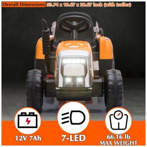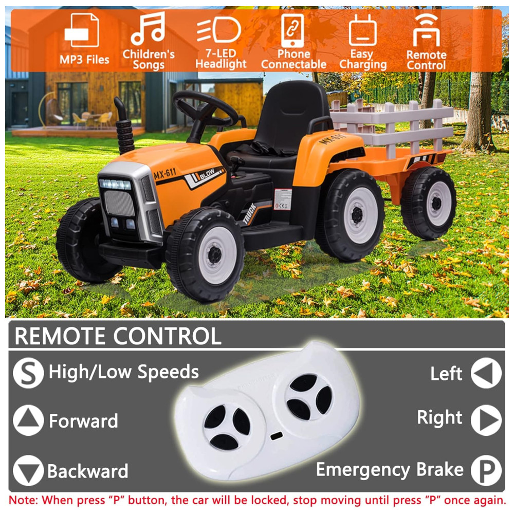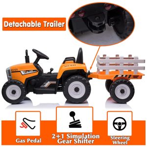 O trator também possui um reboque removível que permite às crianças transportar brinquedos, bonecas, grama, palha, e desfrutar de momentos de lazer. Você pode remover o trailer para armazenar convenientemente. O trator vem com algumas músicas infantis e você pode conectar seus dispositivos ao trator para tocar músicas ou histórias favoritas de seus filhos, aumentando o prazer de dirigir. Há um indicador de bateria no painel. Este carro de passeio é fabricado com um corpo de plástico PP durável e é um presente perfeito para crianças no Dia de Ação de Graças, Natal, Ano Novo, etc.