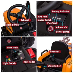 Este trator Rideon é certificado pela ASTM F963 e possui um design realista. Ele tem uma alavanca de câmbio que corresponde a duas marchas à frente e uma marcha à ré, um cinto de segurança ajustável, farol LED com 7 peças, dois motores potentes de 25 W e uma buzina acionada pela pressão do ar que emite sons engraçados.