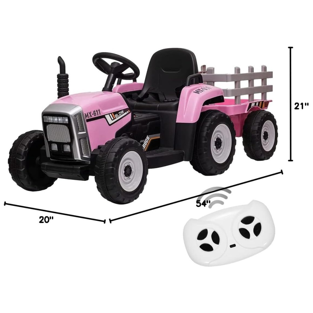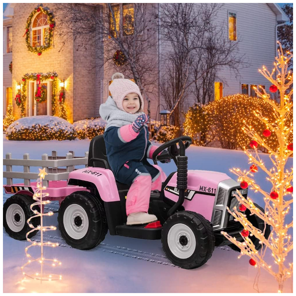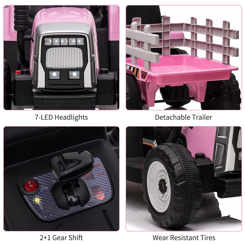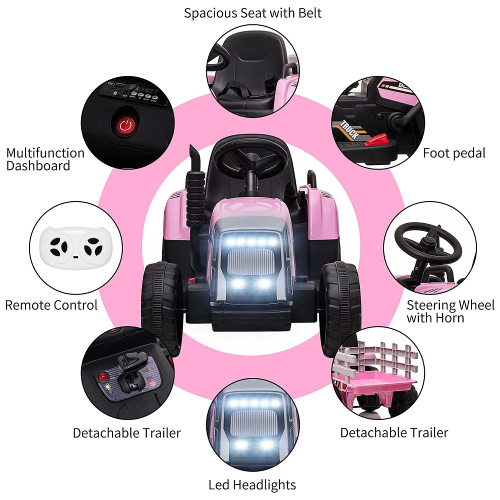 O trator também é equipado com diversas funcionalidades divertidas, incluindo som de motor realista, buzina, música, MP3, porta USB, cartão TF, indicador de bateria, função Bluetooth e faróis brilhantes de 7LED. O design é inspirado em um trator real, com câmbio de 21 marchas realista, apoio de braço sólido e reboque removível.