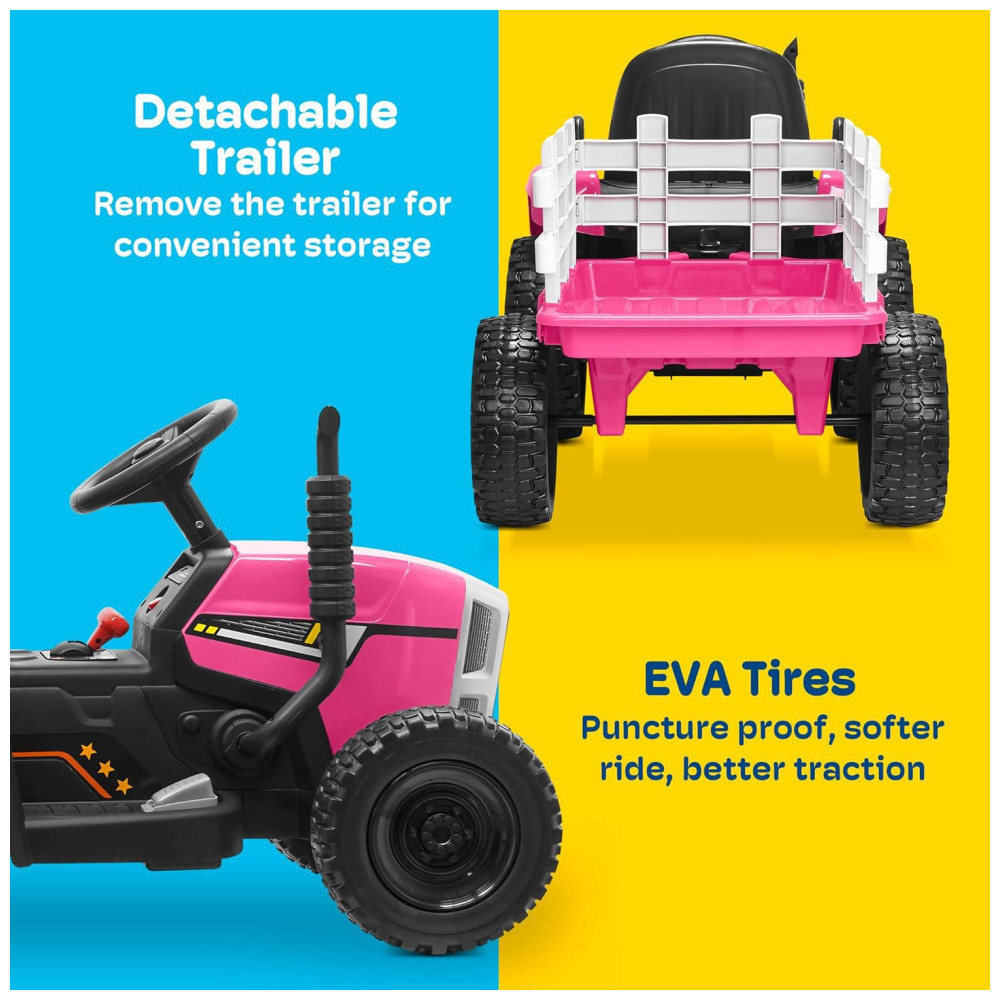 O trator vem equipado com uma bateria Leadacid recarregável de 12V com tempo de carregamento de 8 a 12 horas. A capacidade máxima de peso é de 29,93 quilos e é adequado para crianças a partir de 3 anos. Com quatro grandes pneus EVA, o trator oferece uma condução suave em diversas superfícies, sendo ideal para brincadeiras internas e externas.