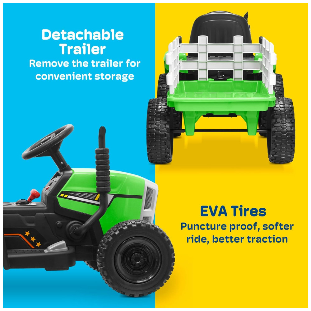Surpreenda seu jovem agricultor com este trator de brinquedo de aparência realista. Com faróis de 7LED, painel de controle, botão de mudança e apoio de braço sólido, as crianças terão uma experiência autêntica de condução. O trailer removível é perfeito para armazenar pequenos brinquedos e lanches, além de permitir que as crianças dirijam no quintal ou jardim e carreguem ferramentas e suprimentos de jardim para mais diversão.