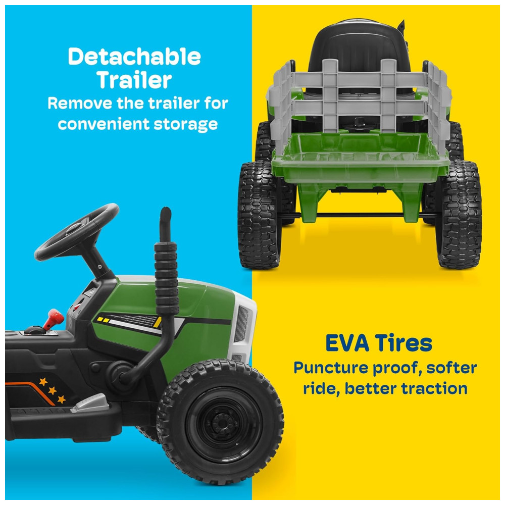Surpreenda seu jovem agricultor com este trator de aparência realista, equipado com faróis de 7LED, painel de controle, botão de mudança e apoio de braço sólido para uma experiência autêntica. O trailer removível é perfeito para armazenar pequenos brinquedos ou lanches, além de permitir que as crianças dirijam no quintal ou jardim e carreguem ferramentas e suprimentos de jardim para mais diversão.
