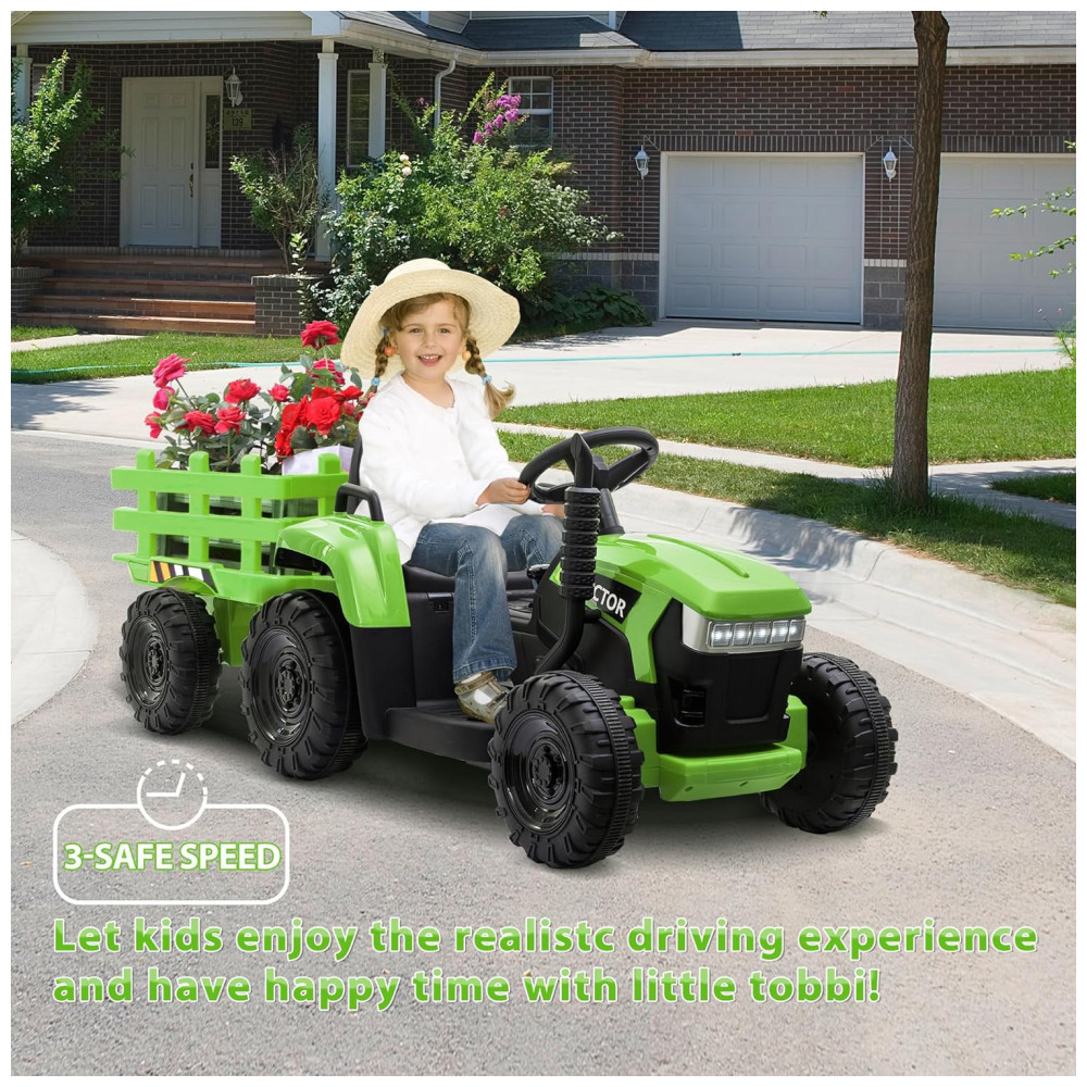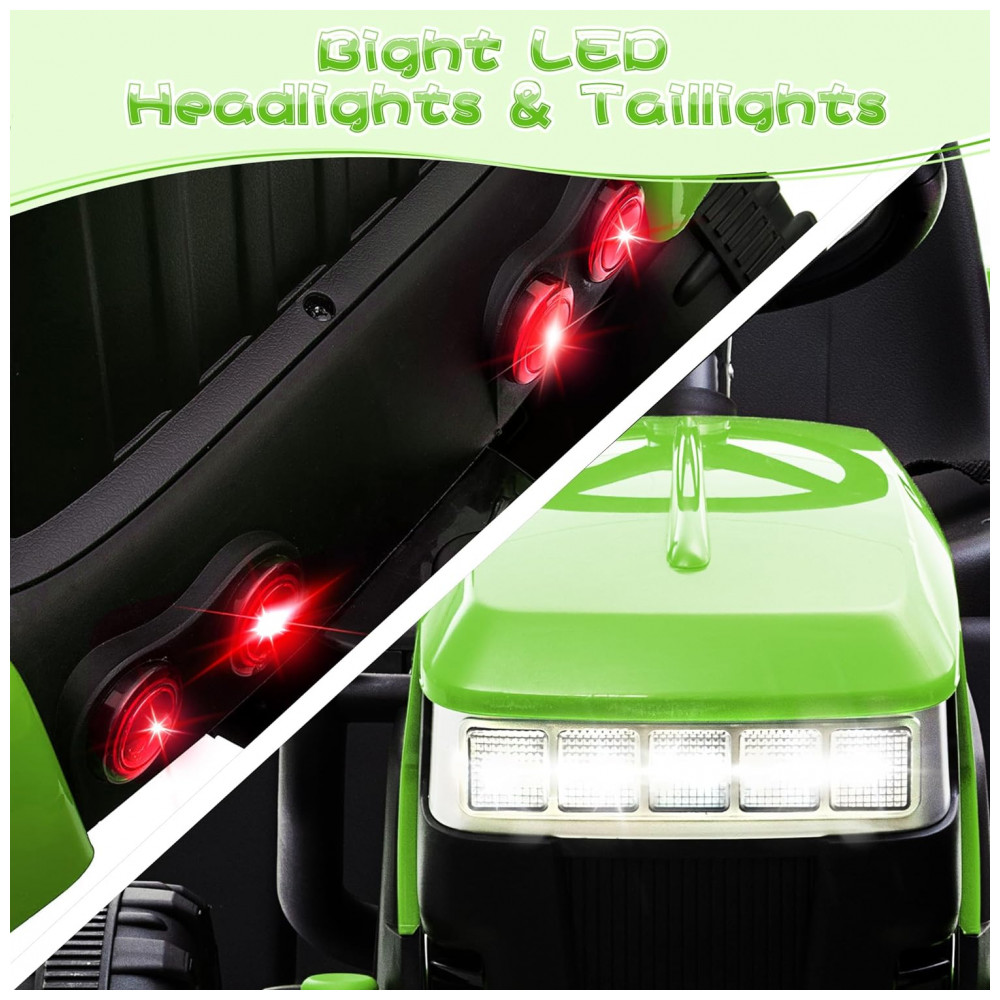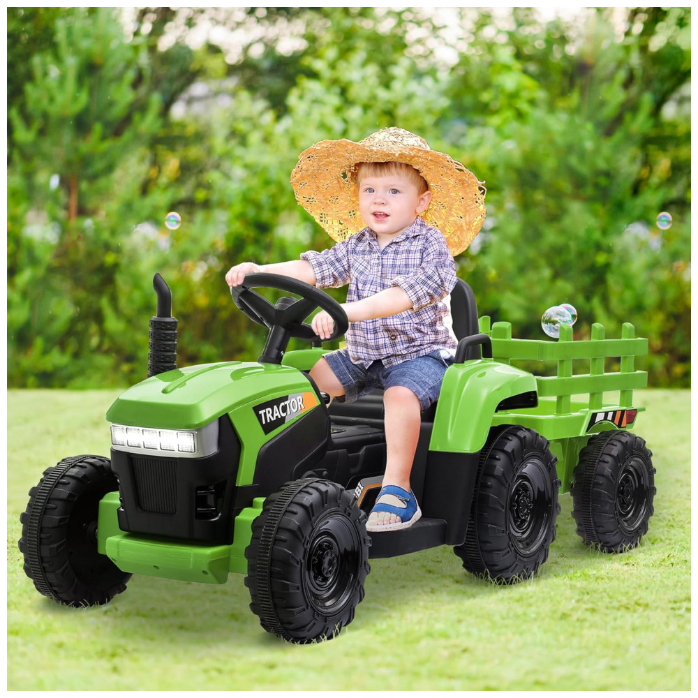 Trator Elétrico Infantil com Reboque e Motores Duplos de 35W á Bateria 12V 3 Marchas e Luzes LED TOBBI Verde