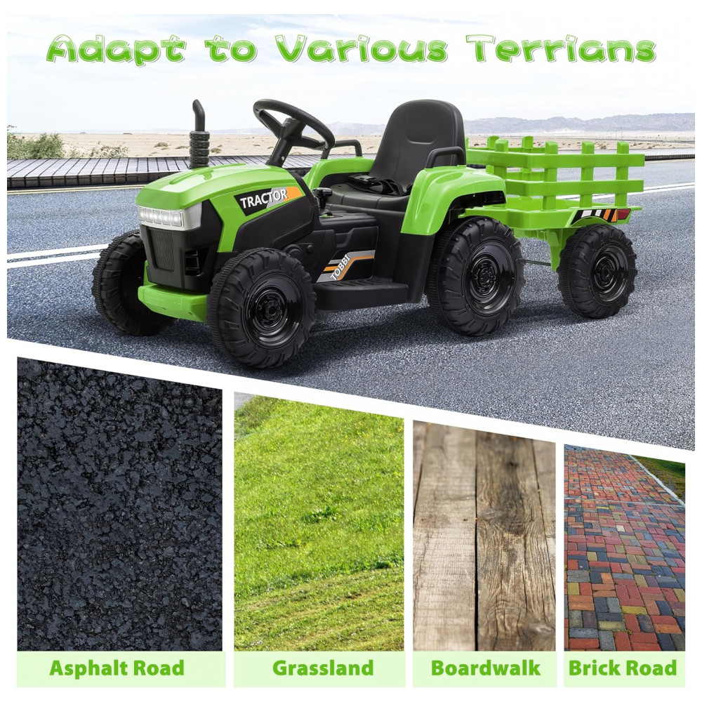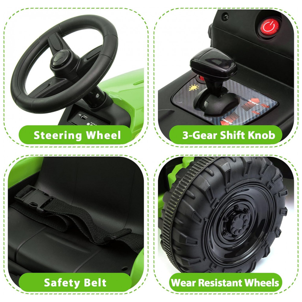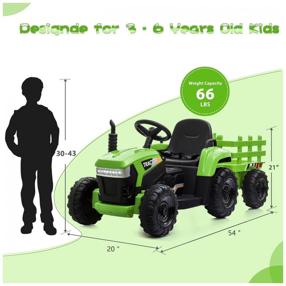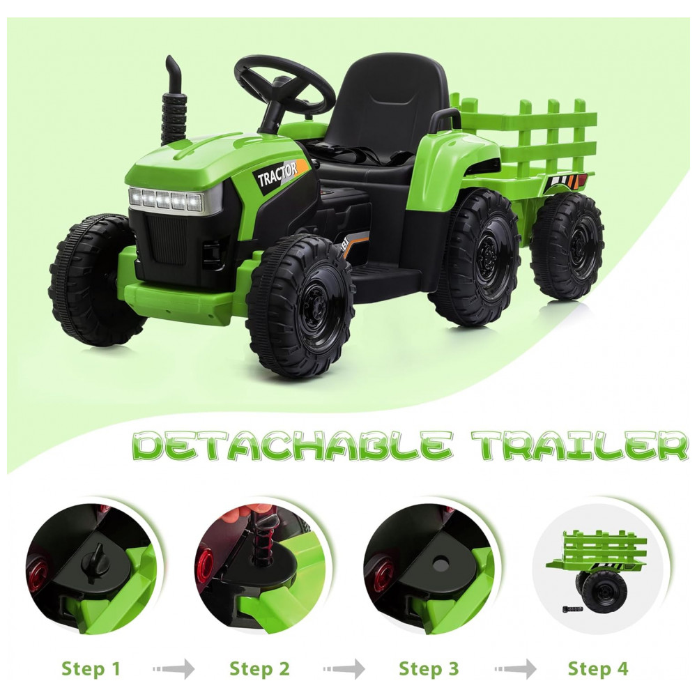 Trator Elétrico Infantil com Reboque e Motores Duplos de 35W á Bateria 12V 3 Marchas e Luzes LED TOBBI Verde