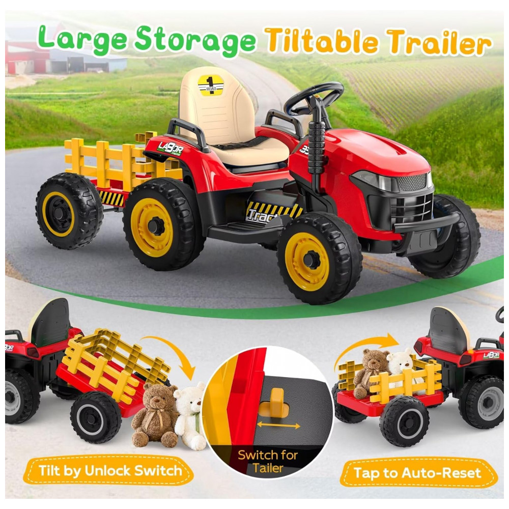 Trator Infantil Elétrico ANPABO Vermelho 24V Trailer Basculante Removível Pneus EVA Controle Remoto com Som Realista e Bluetooth