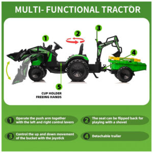 Trator Infantil Elétrico GarveeLife Verde 24V 3 em 1 Escavadeira Buldôzer Trailer Controle Remoto Luzes LED Bluetooth