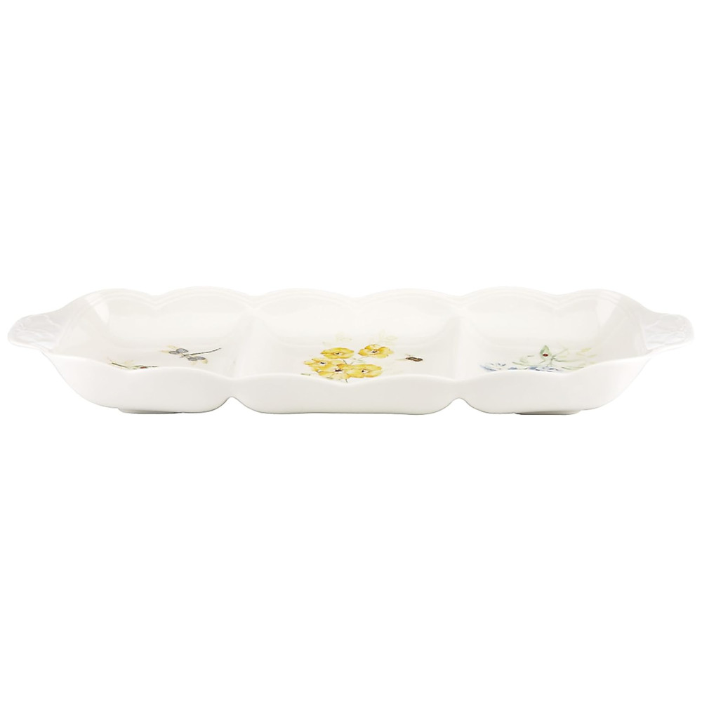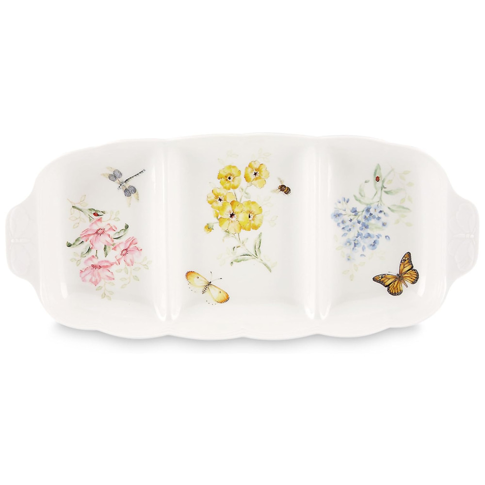 Entre as peças disponíveis, destaca-se a bandeja retangular com alças, dividida em três seções iguais, perfeita para servir molhos, petiscos, vegetais ou doces. Feita de porcelana branca Lenox resistente a lascas, essa bandeja é adequada para congelar, aquecer no micro-ondas e lavar na máquina de lavar louça. Cada peça é delicadamente adornada com flores e borboletas em cores requintadas, trazendo charme e beleza para qualquer ocasião.
