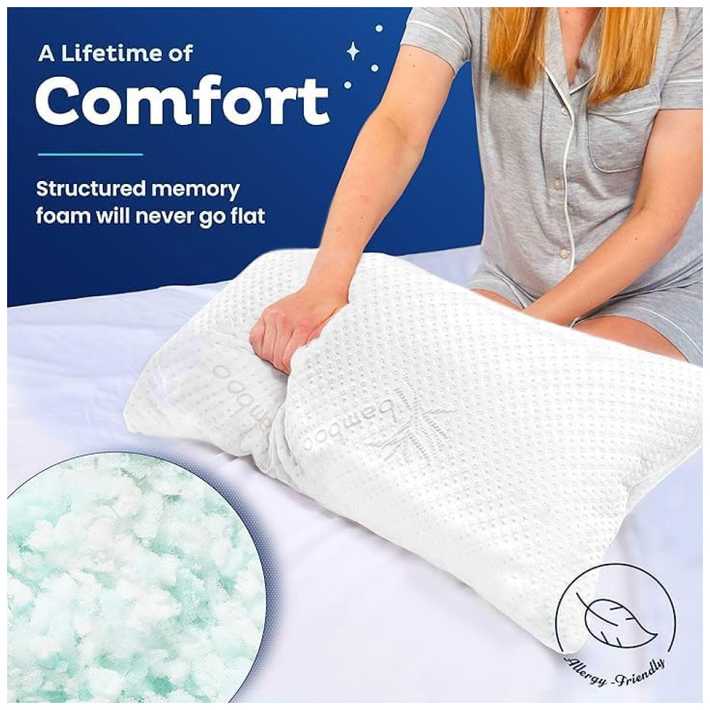 Memory Foam Esta luxuosa almofada de bambu é o material de que são feitos os sonhos. A mistura patenteada de espuma viscoelástica fragmentada fornece suporte de flutuação adicional e foi projetada pensando em você e em seu horário de sono.