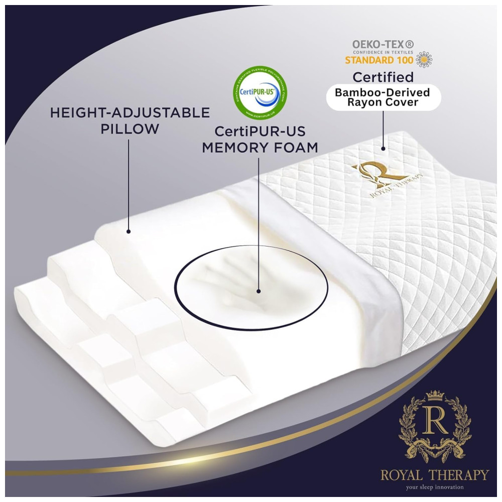 ALMOFADA DE ESPUMA DE MEMÓRIA ULTRA AJUSTÁVEL QUEEN SIZE As almofadas de cama aconchegantes Royal Therapy são projetadas para se adequar ao formato exclusivo do corpo para ajudar a apoiar a cabeça e o pescoço. Fornece suporte uniforme para o pescoço e a cabeça. Esta almofada de bambu permite uma pressão uniforme em todas as áreas da cabeça e do pescoço. Ao remover a camada intermediária de espuma, sua construção permite que seja perfeita para todos os tipos de travessas lateral , costas , estômago.