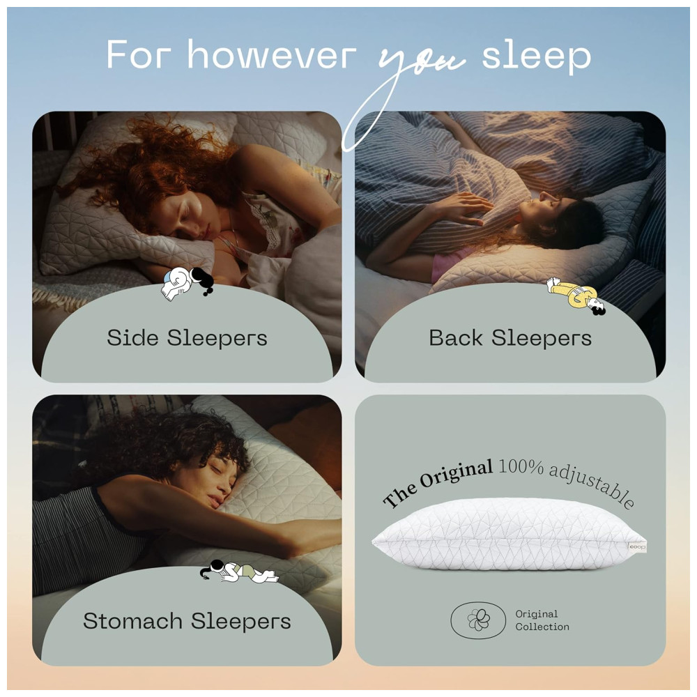 TOTALMENTE AJUSTÁVEL, VOCÊ ESTÁ NO CONTROLE Sentir dor, roncar ou se virar na cama são sinais de que você está dormindo mal. Nosso design ajustável exclusivo permite que você acesse o preenchimento de espuma de memória, que você pode adicionar ou remover para se adequar ao seu tamanho, forma ou posição de dormir. DORMIR À DIREITA Preenchimento de espuma, que você pode adicionar ou remover de acordo com seu tamanho, forma e posição de dormir. Durma confortavelmente e enfim alinhado.