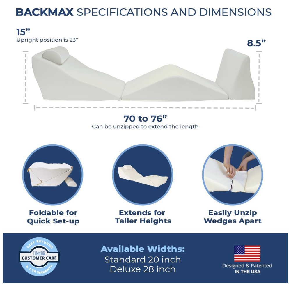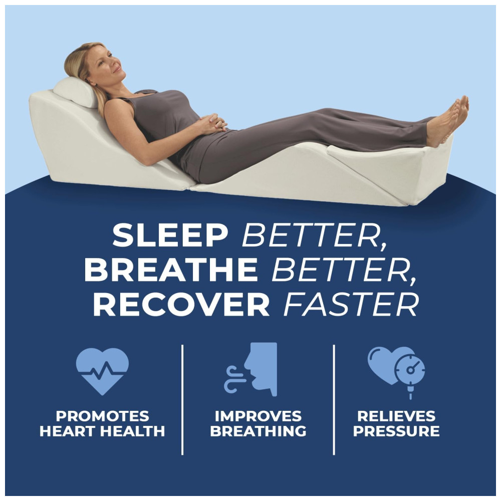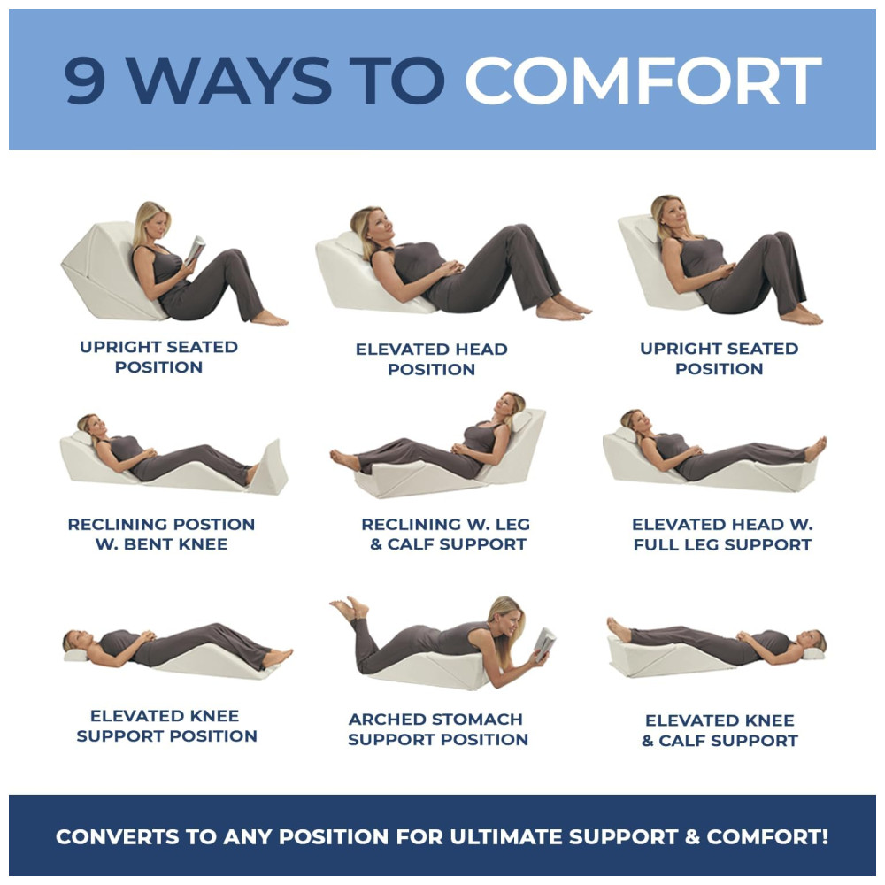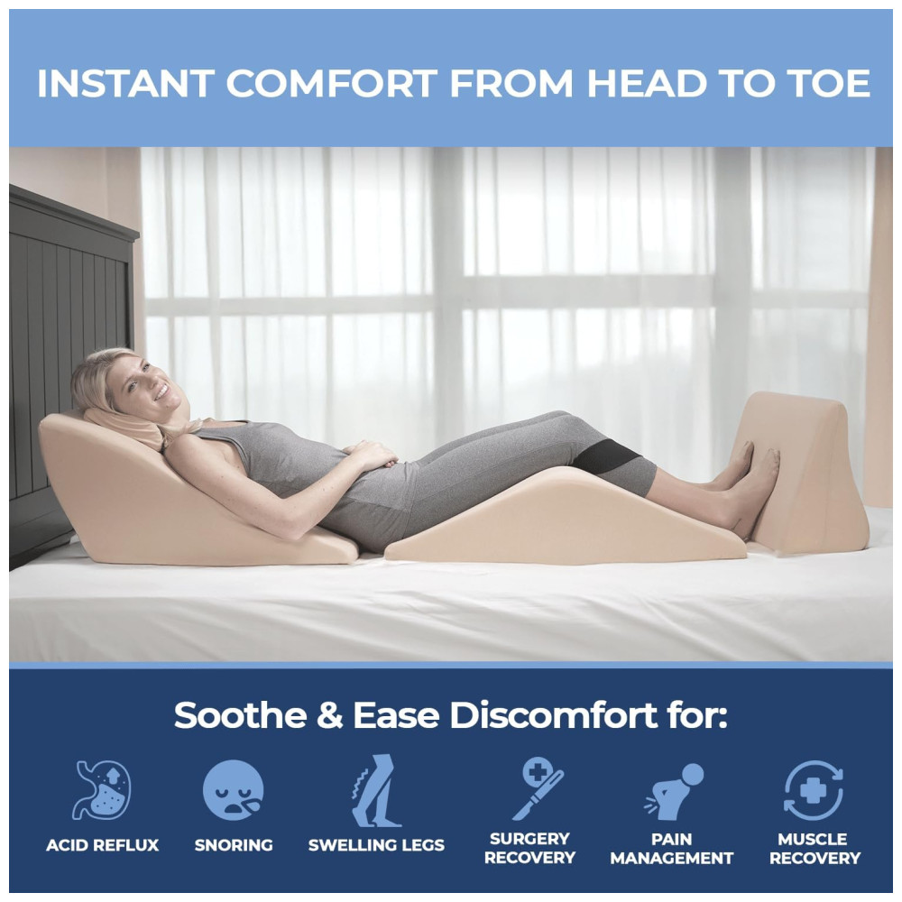 Este travesseiro ortopédico de corpo inteiro em cunha de 4 peças é ideal para quem busca conforto e suporte ao dormir, relaxar ou se recuperar. O conjunto inclui três travesseiros de cunha com suporte lombar embutido, almofada de cunha para as costas, almofada de elevação para as pernas e joelhos, e apoio para os pés. A cunha de espuma proporciona um posicionamento confortável sem peso, aliviando a pressão e ajudando a aliviar a dor nas costas. A inclinação gradual também oferece o posicionamento perfeito para dormir elevado em uma cunha de cama, ajudando a aliviar o desconforto respiratório, digestivo, circulatório ou muscular. O travesseiro é configurável em 9 posições diferentes, permitindo que você ajuste o suporte de acordo com suas necessidades. A espuma é durável e de alta resiliência, perfeita para uso diário ou dobrável para armazenamento ou viagem. A capa com zíper é antiderrapante, respirável e lavável à máquina, com tecido microaderente na parte inferior das cunhas, evitando que as almofadas triangulares se movam durante o uso ou se forem usadas separadamente. Como bônus, o travesseiro de viagem Half Moon Wedge oferece suporte cervical para ajudar a atingir o alinhamento perfeito da coluna cervical.