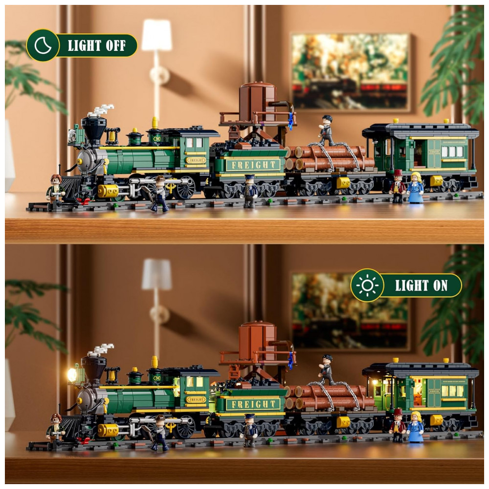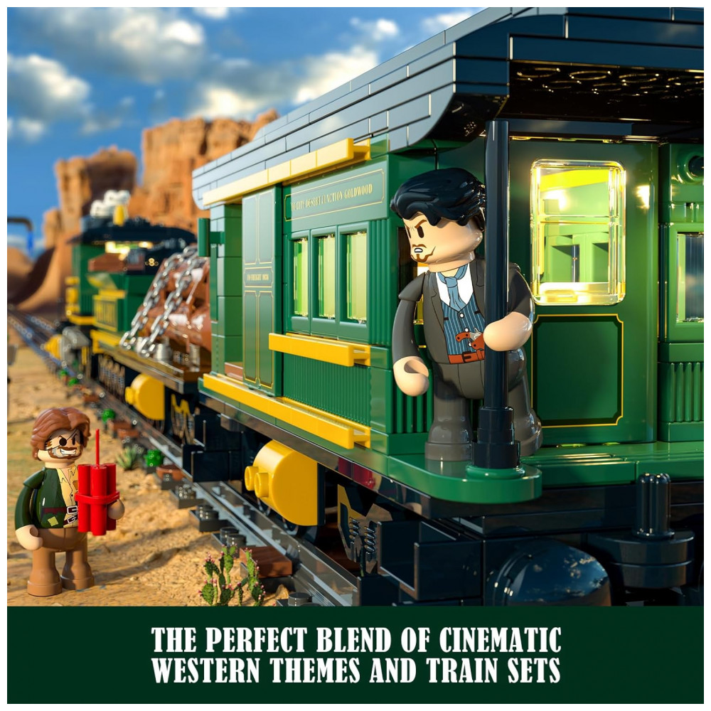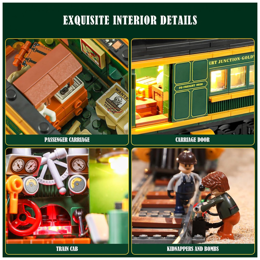 O sistema de iluminação integrado realça áreas como cabine da locomotiva e pontos selecionados dos vagões, favorecendo montagens em ambientes com pouca luz. O produto é indicado para montadores em nível avançado, com foco em exposição em coleções temáticas de veículos e cenários do Velho Oeste.