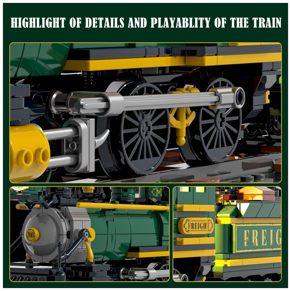 Os vagões incluem opções para transporte de carvão, toras de madeira e passageiros, permitindo reorganizar a composição conforme a cena desejada. O conjunto utiliza trilhos compatíveis com a escala declarada, possibilitando a circulação do trem sobre a via montada com blocos interligáveis.