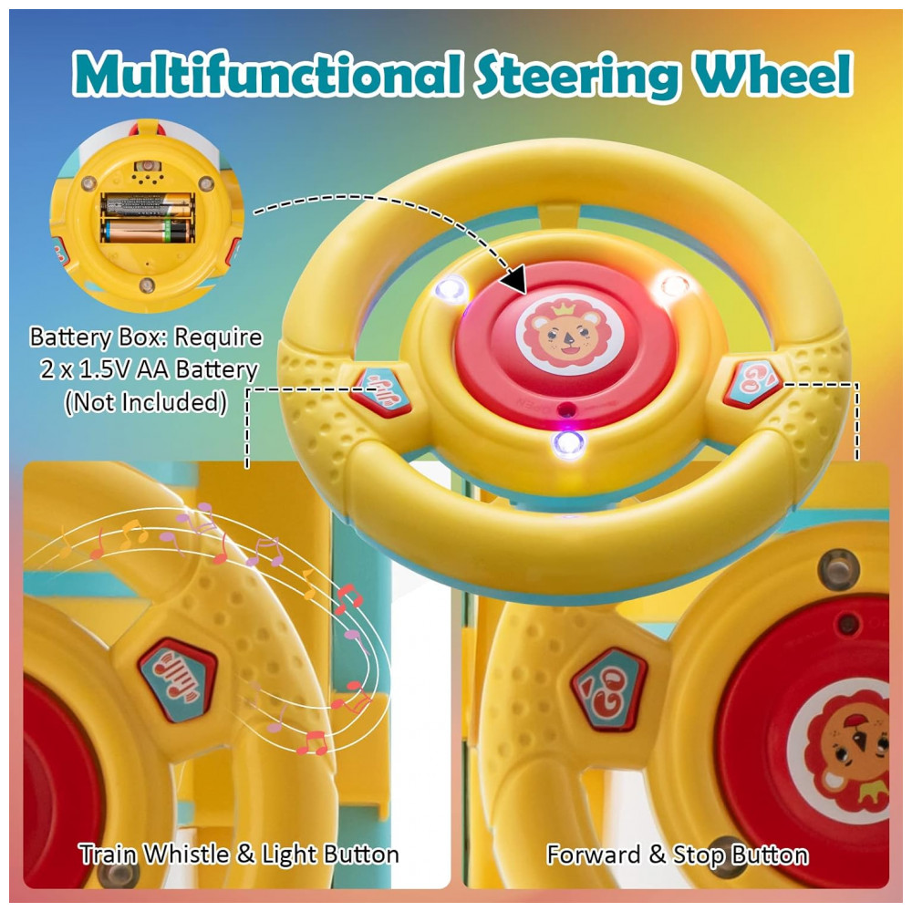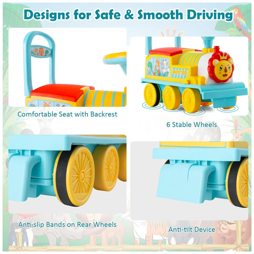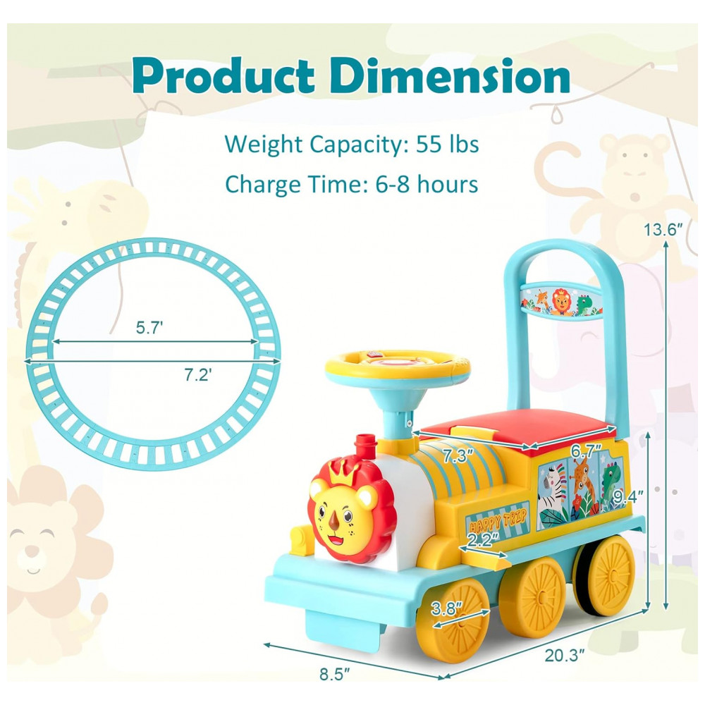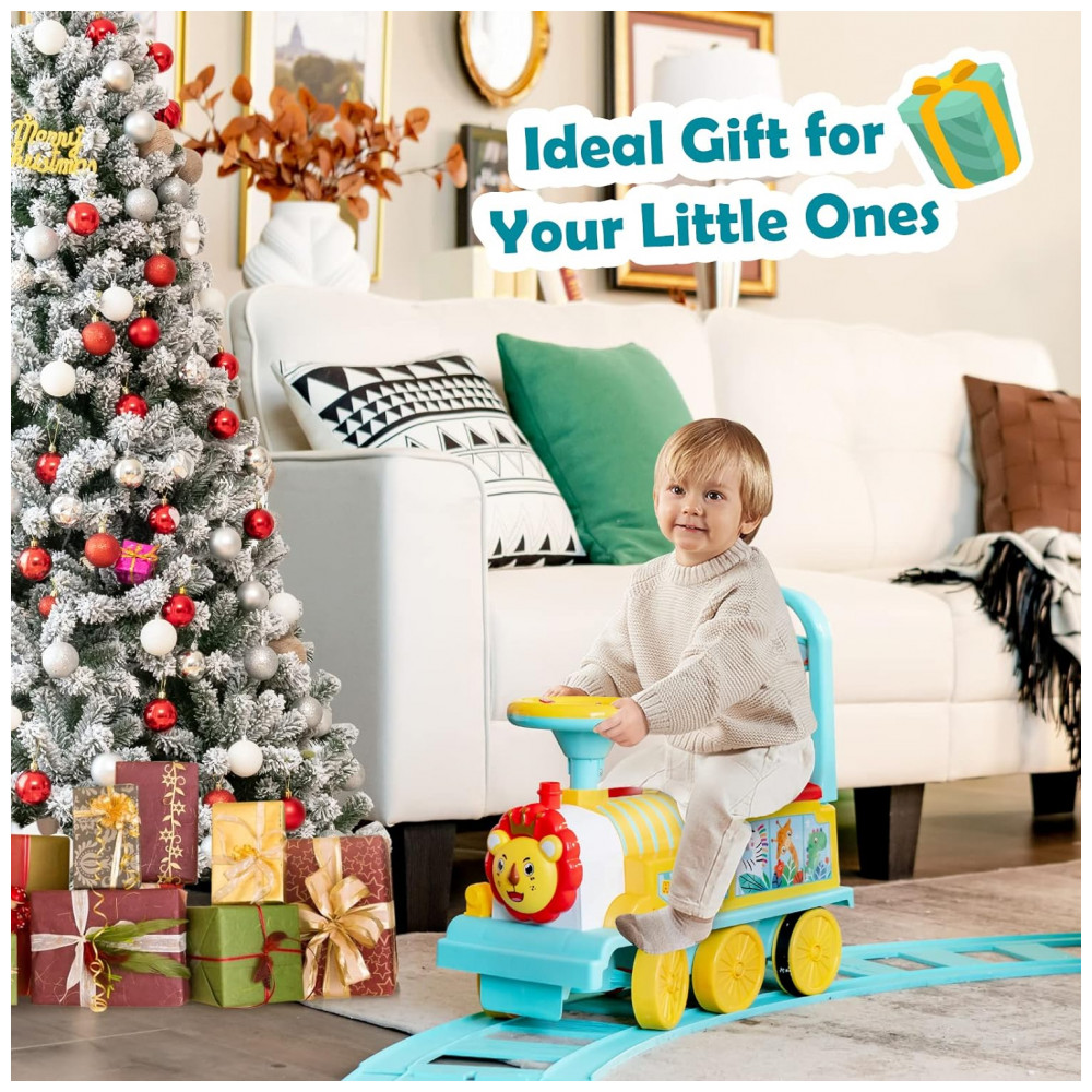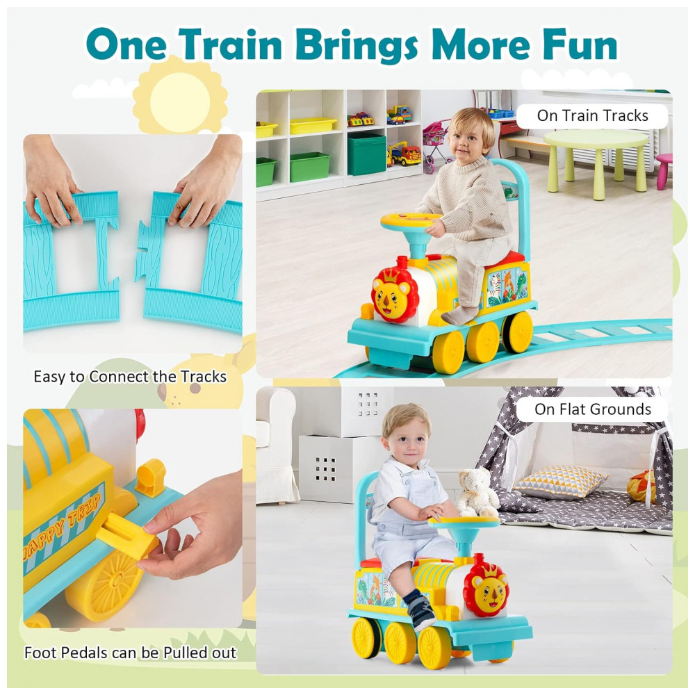 Este brinquedo de passeio de trem elétrico tem apitos de trem realistas e luzes coloridas, o que torna a condução mais divertida. E para uma condução confortável, as crianças podem colocar os pés nos pedais retráteis. Além disso, a caixa escondida debaixo do assento oferece espaço de zenamento adicional para brinquedos infantis, lanches e assim por diante.