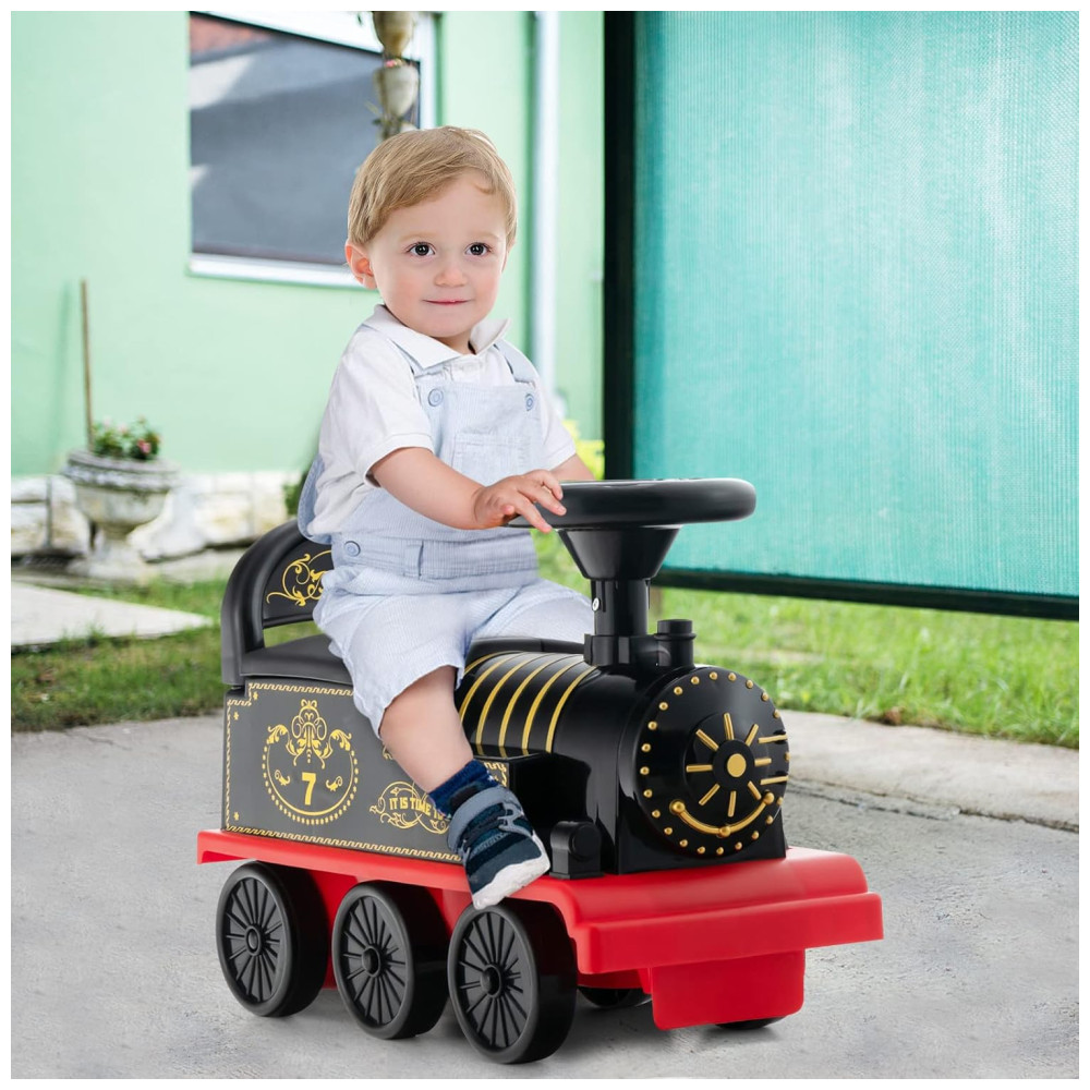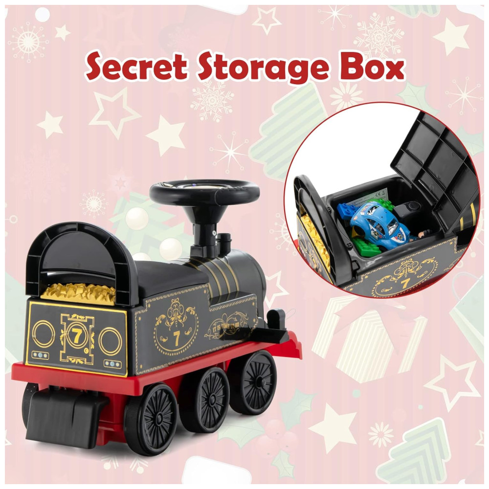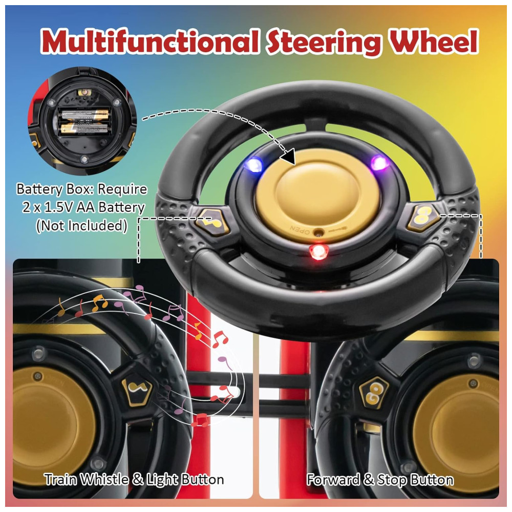 Este brinquedo de passeio de trem elétrico tem apitos de trem realistas e luzes coloridas, o que torna a condução mais divertida. E para uma condução confortável, as crianças podem colocar os pés nos pedais retráteis. Além disso, a caixa escondida debaixo do assento oferece espaço de zenamento adicional para brinquedos infantis, lanches e assim por diante.