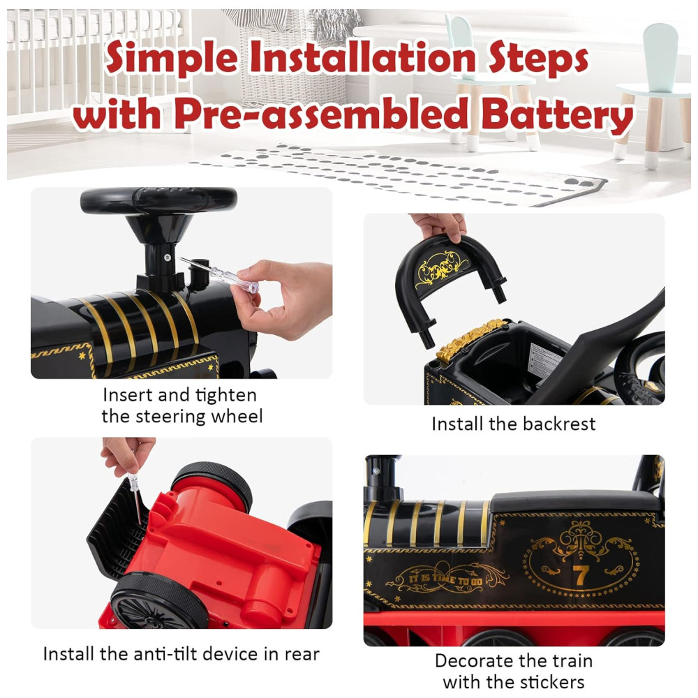 A montagem da bateria foi concluída, então este passeio elétrico no brinquedo leva apenas alguns passos simples para instalar. Após uma configuração fácil, seus filhos podem decorar o trem com os adesivos e depois desfrutar de uma feliz viagem de trem.