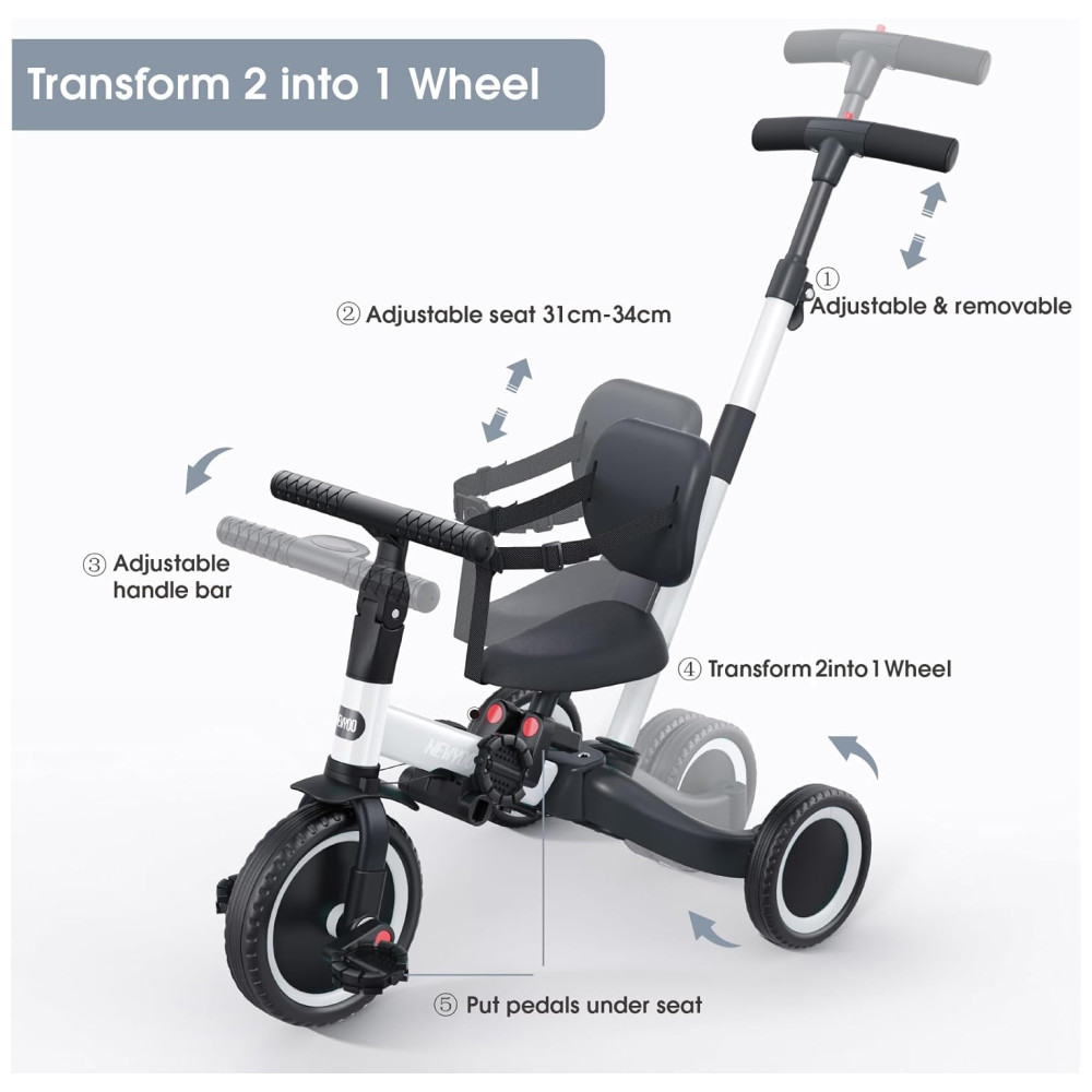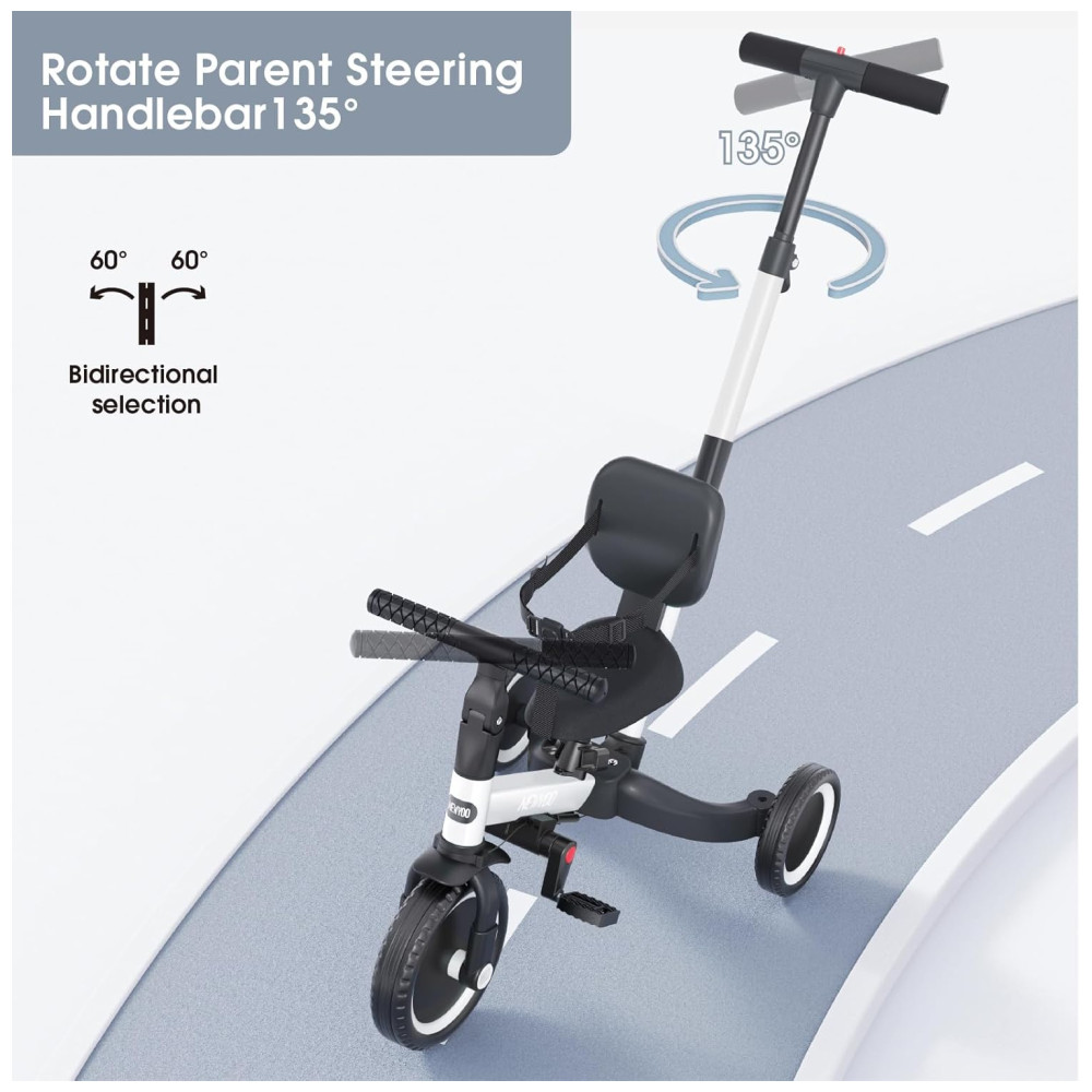 5 modos: Modo Push Tricycle, Modo Push Balance Bike, Modo Triciclo, Modo Balance Bike e Modo Bike. O triciclo multifuncional é adequado para meninos e meninas de 1, 2,3 e 4 anos.