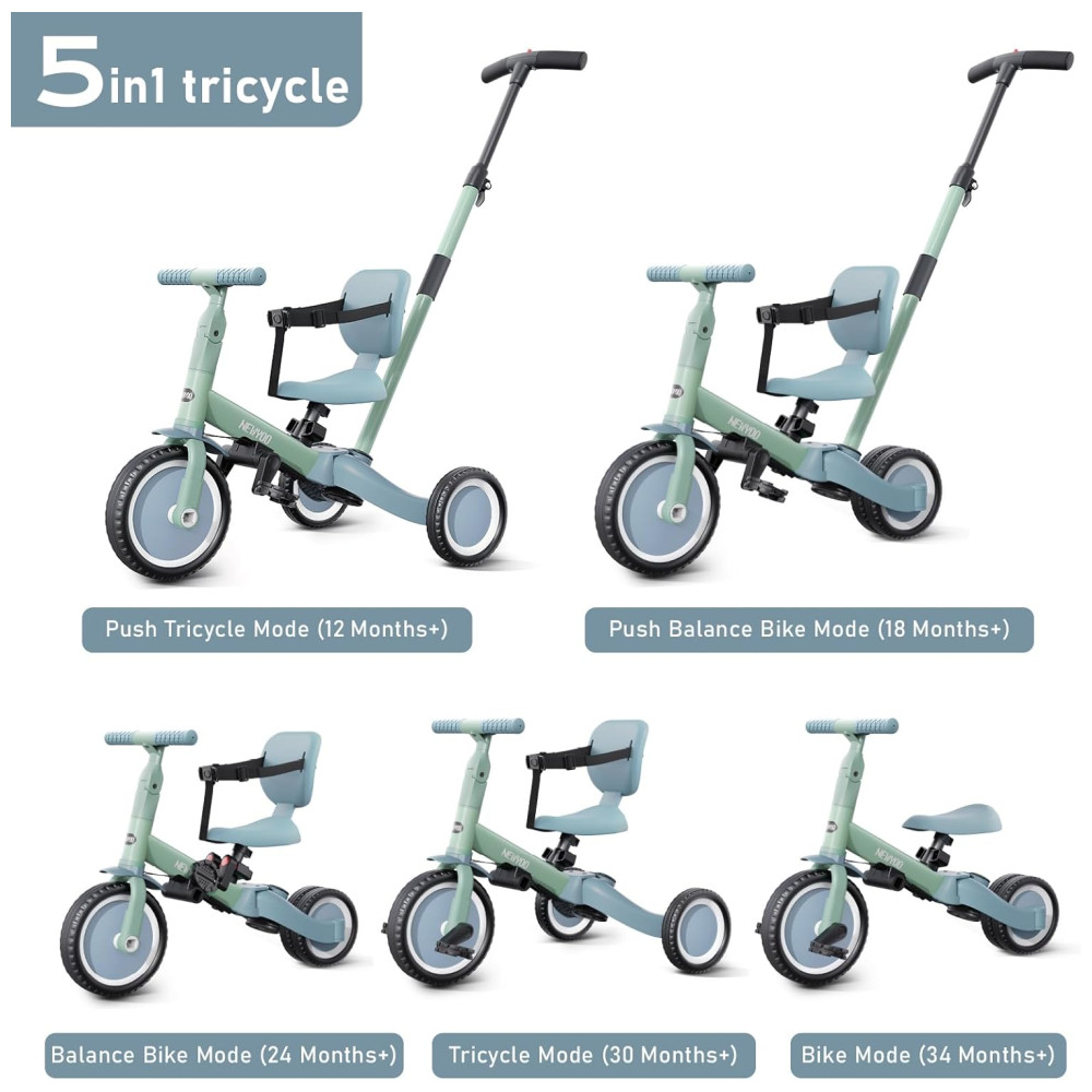 5 modos: Modo Push Tricycle, Modo Push Balance Bike, Modo Triciclo, Modo Balance Bike e Modo Bike. O triciclo multifuncional é adequado para meninos e meninas de 1, 2,3 e 4 anos.