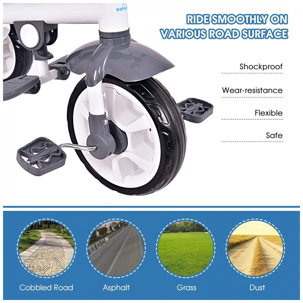 Projetado para maior comodidade: Equipado com cinto de segurança e guarda corpo de 3 pontos, o triciclo para bebês garante uma condução segura. O guarda corpo removível facilita a colocação ou transporte do bebê. E o sino interessante pode atrair a atenção do bebê. Além disso, o cesto traseiro com zíper agrega mais comodidade para zenamento.