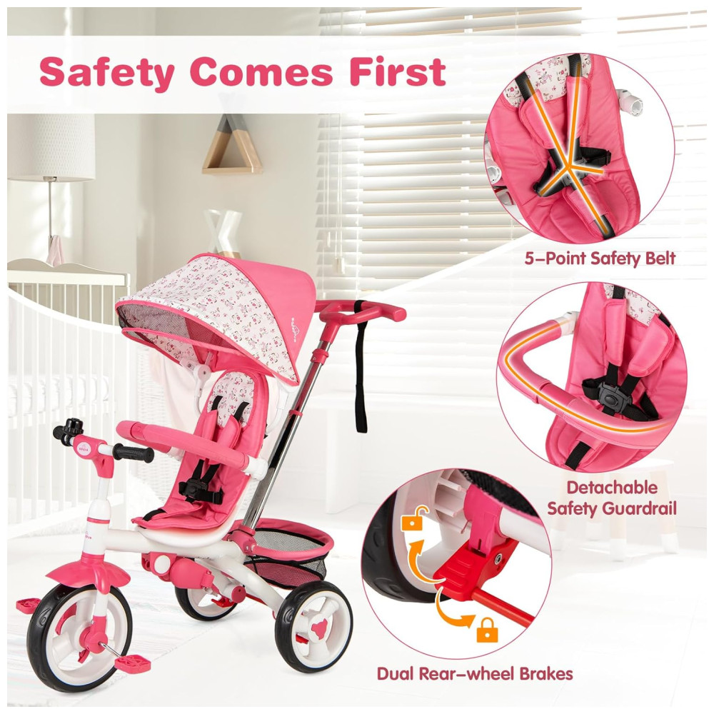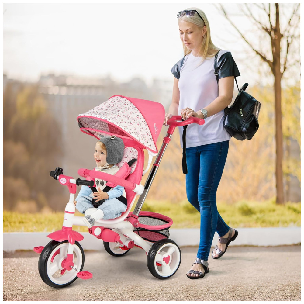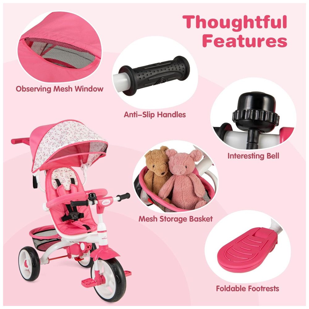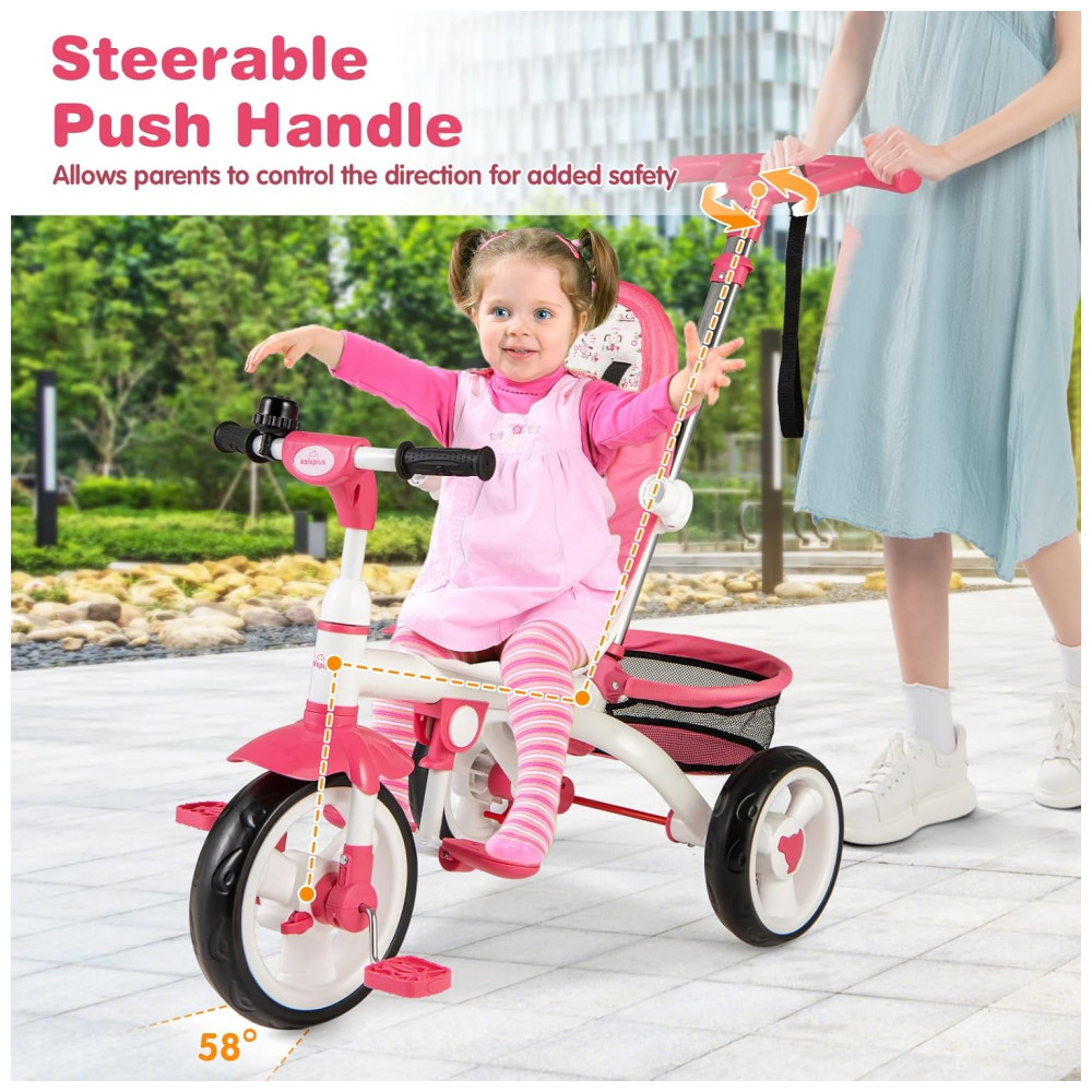 Triciclo Infantil 4 em 1 com Alça Removível Sino Assento Giratório e Cesta de zenamento para Crianças de 1 a 5 anos Costzon Rosa
