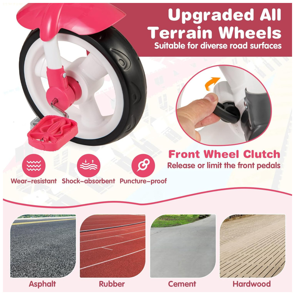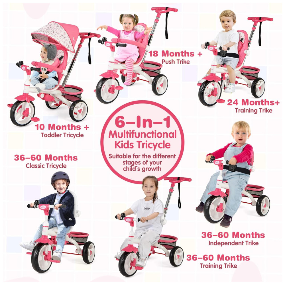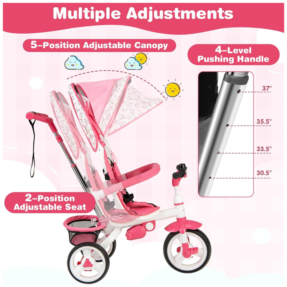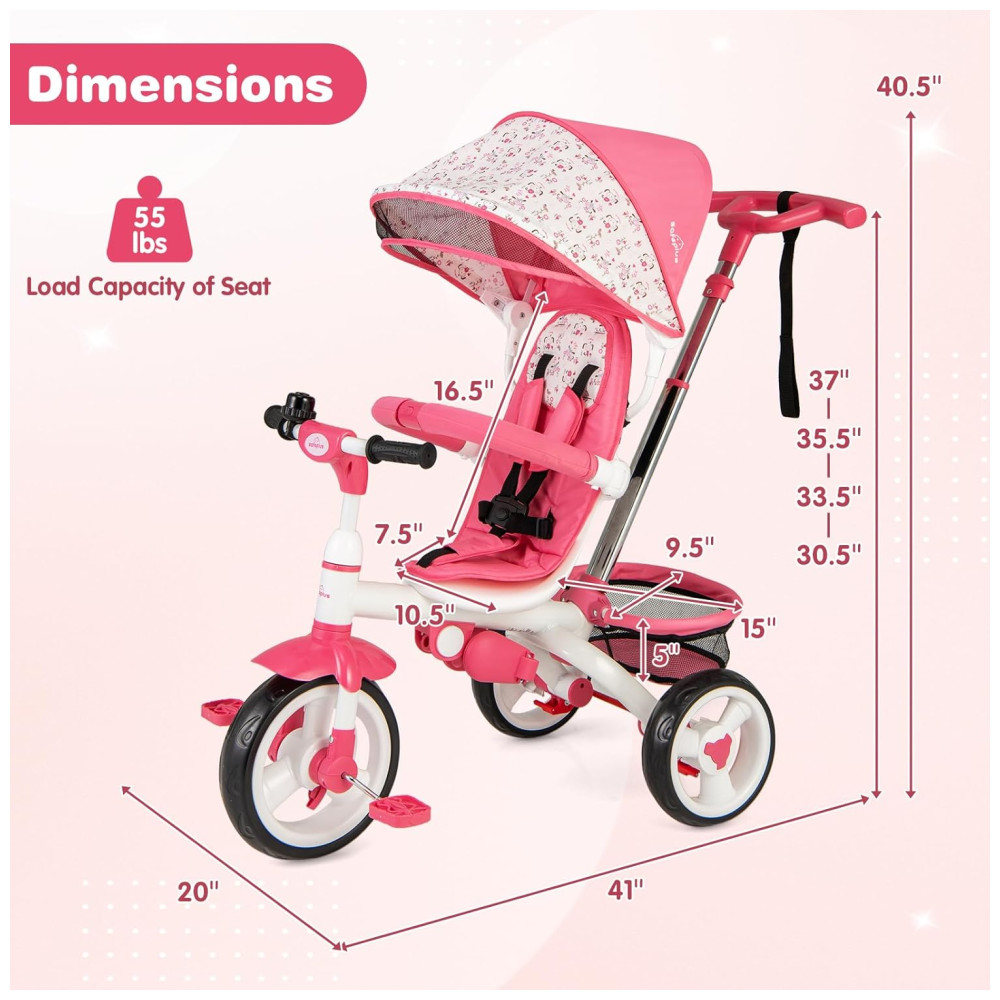 Triciclo Infantil 4 em 1 com Alça Removível Sino Assento Giratório e Cesta de zenamento para Crianças de 1 a 5 anos Costzon Rosa