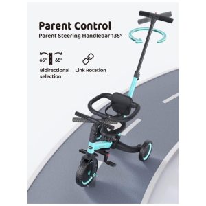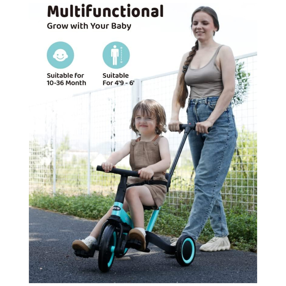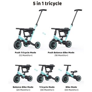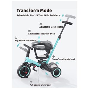 5 modos: Modo Push Tricycle, Modo Push Balance Bike, Modo Triciclo, Modo Balance Bike e Modo Bike. O triciclo multifuncional é adequado para meninos e meninas de 1, 2,3 anos.