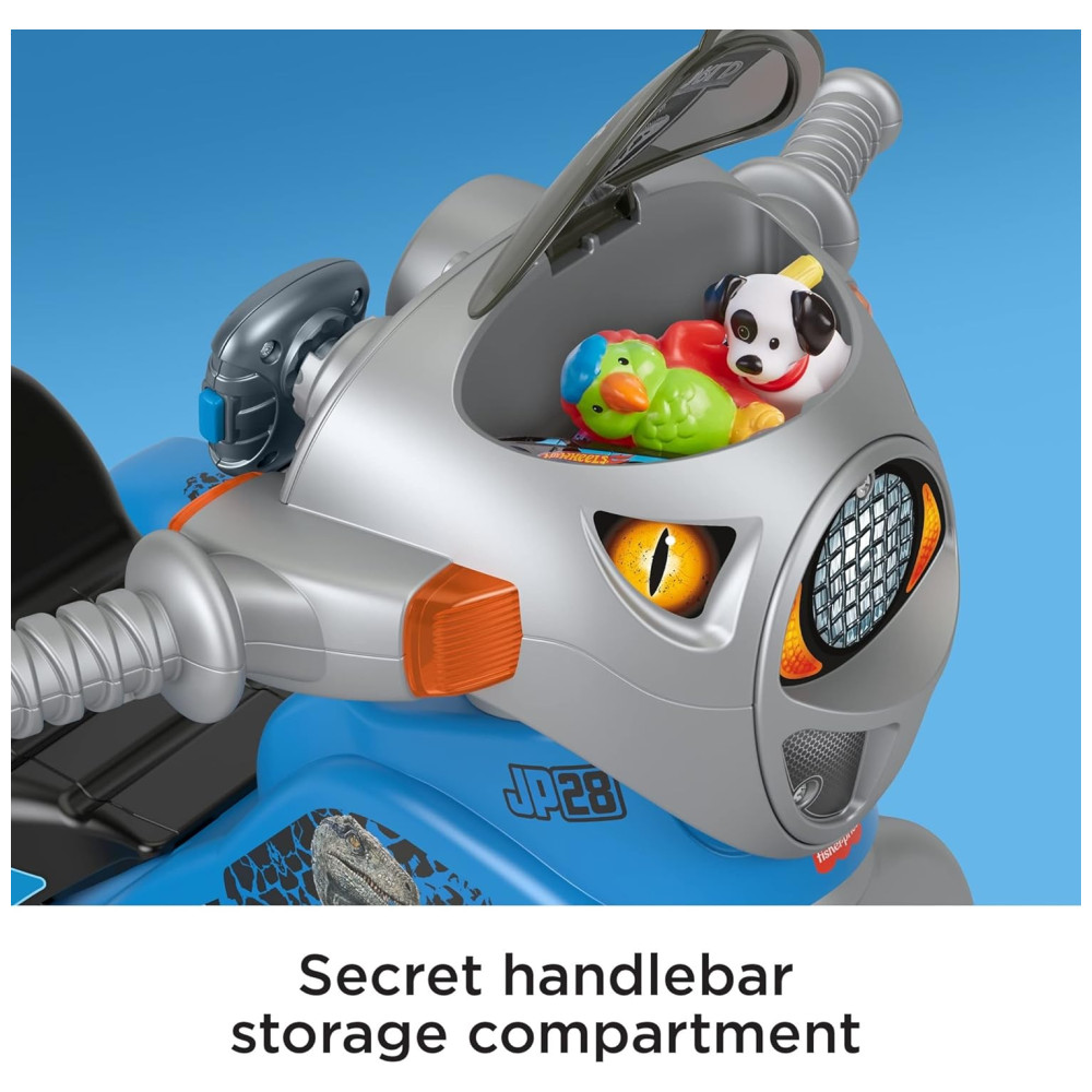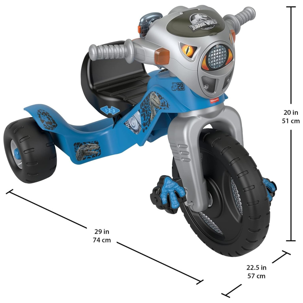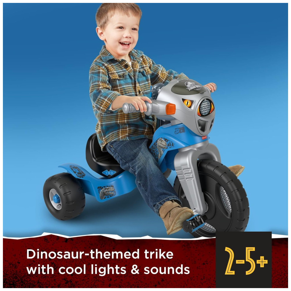 Inspirado na franquia Jurassic World, este triciclo movido a crianças apresenta estilo e sons de dinossauro Velociraptor