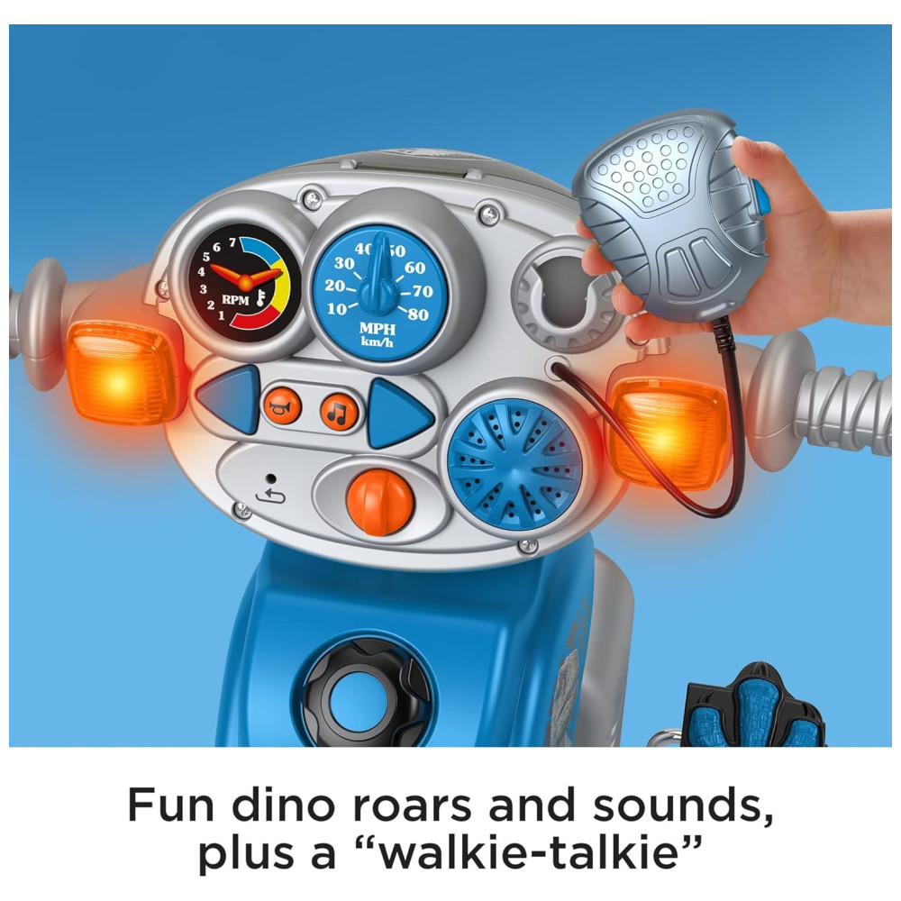 Apresenta luzes legais e sons de dinossauros, além de um walkie talkie para diversão extra