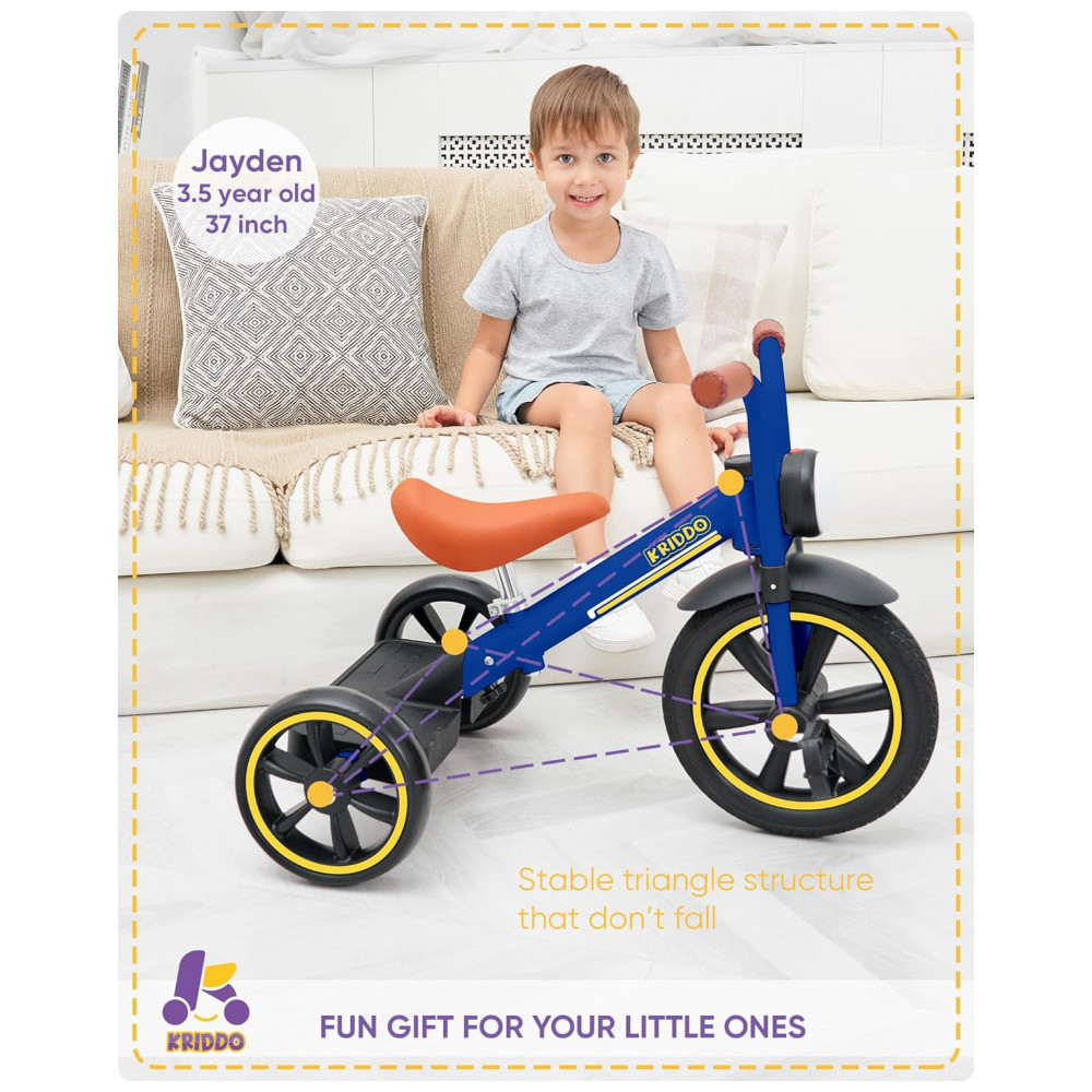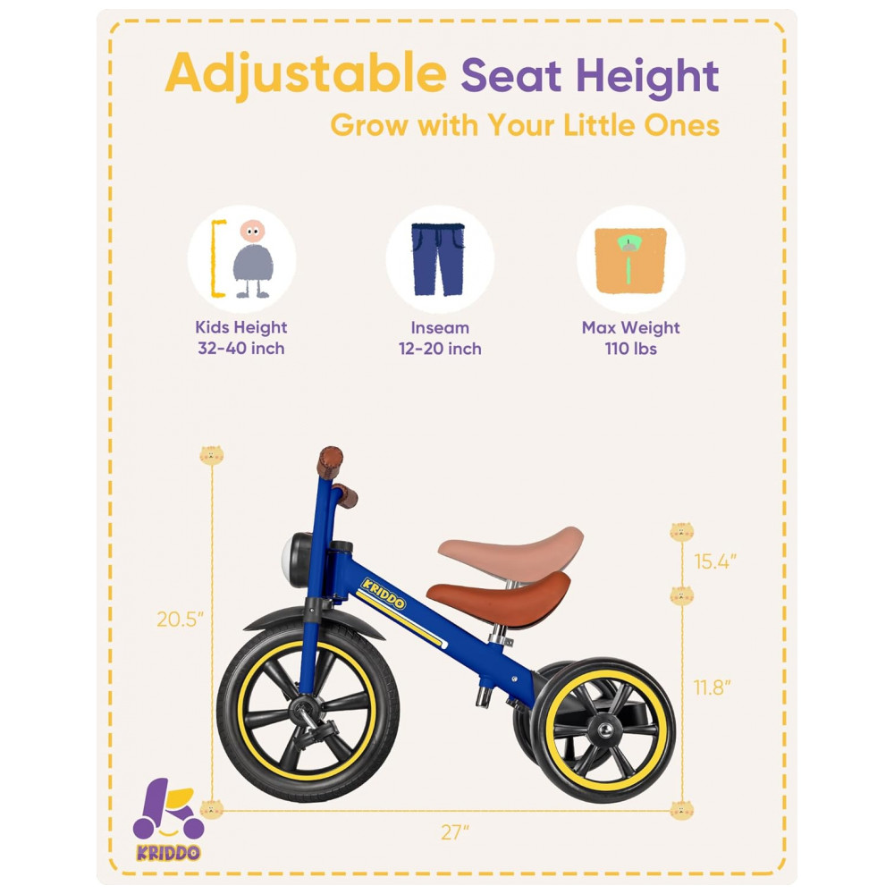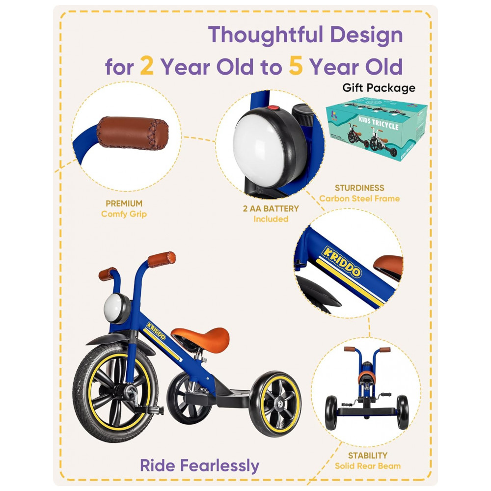 Triciclo Infantil com Luz Frontal e Altura do Assento Ajustável para Crianças de 2 a 5 Anos KRIDDO Azul