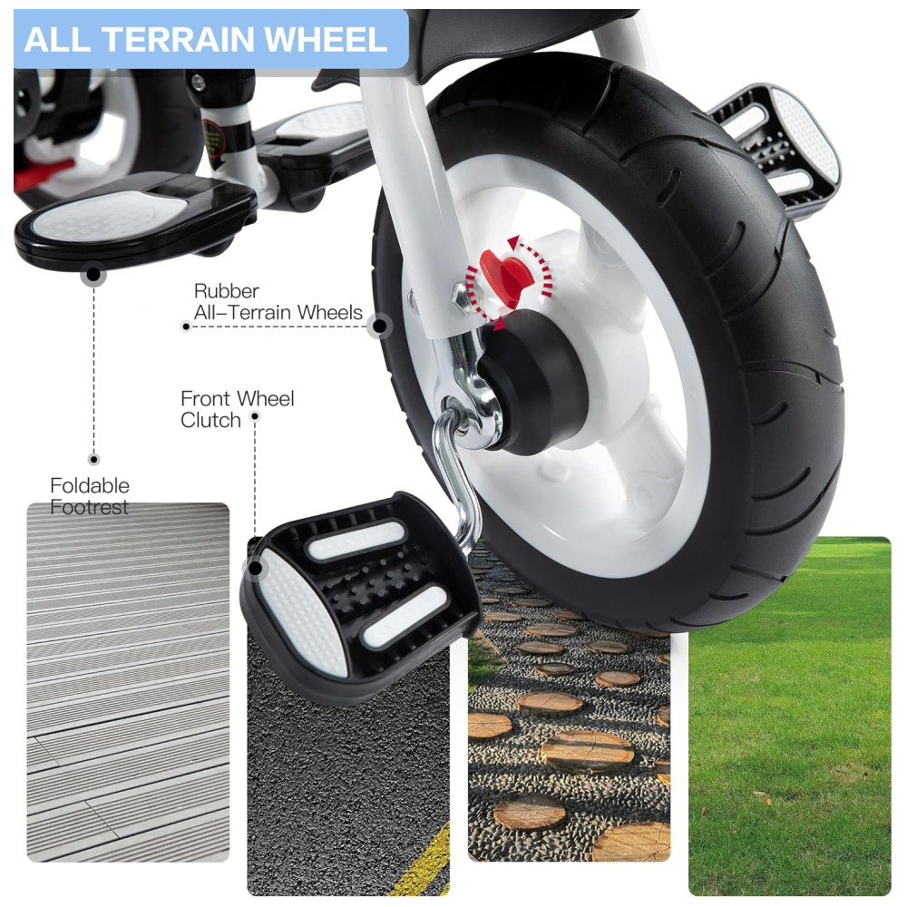 O triciclo JMMD é um produto versátil que pode atender às necessidades de crianças de diferentes idades, de 18 meses a 5 anos. Com seis modos de uso, este triciclo pode ser transformado em triciclo infantil, triciclo de direção, triciclo aprendido, triciclo clássico, assento giratório de 360 graus e modo dobrável. A dobragem rápida permite que o triciclo seja facilmente transportado no porta malas ou armazenado quando não estiver em uso.