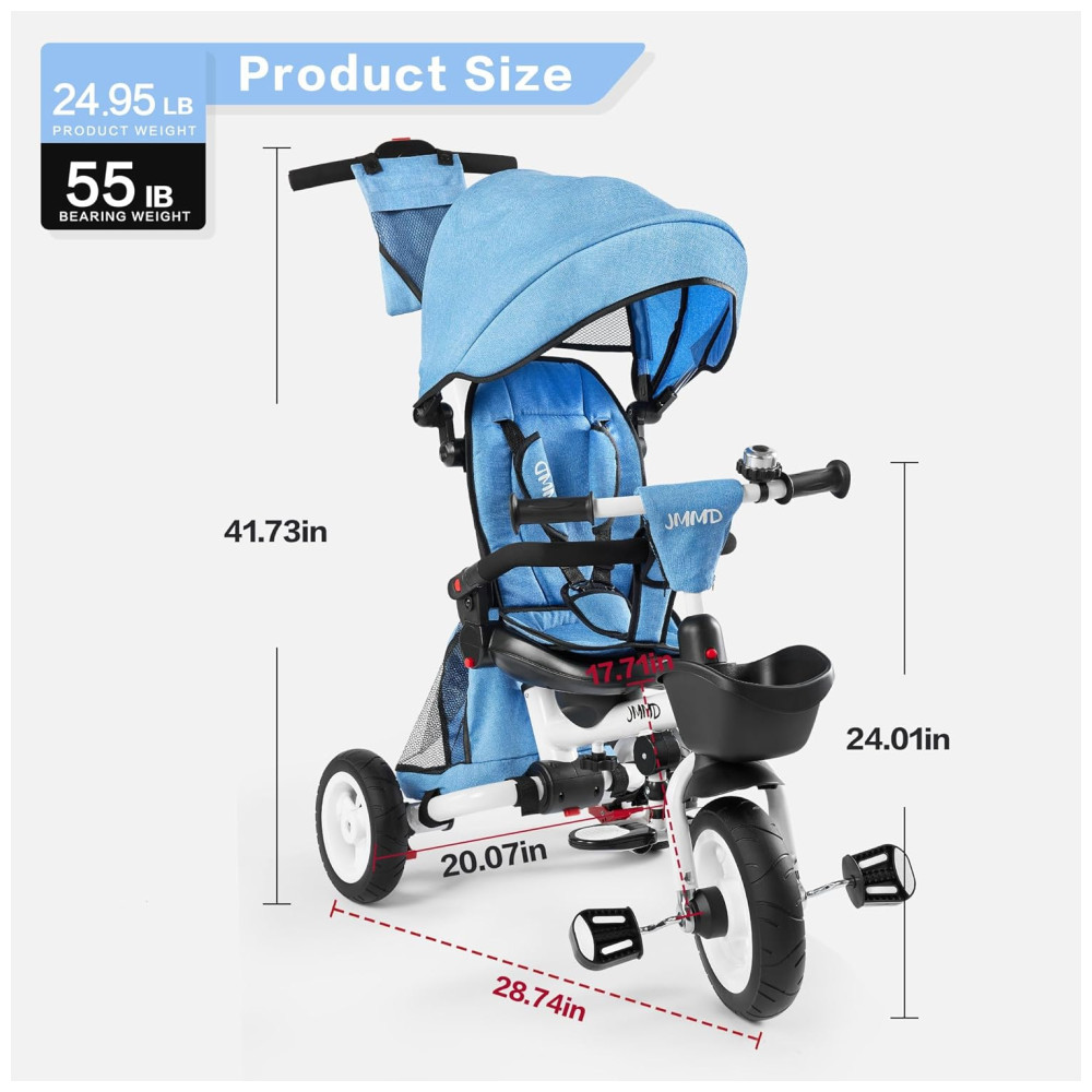 O arnês de segurança de 3 pontos e o guarda corpo de esponja removível oferecem segurança adicional para a criança. A almofada do assento de tecido oxford é removível e lavável, garantindo conforto ao bebê. O triciclo para bebês JMMD também possui vários locais de armazenamento, incluindo bolsa de armazenamento traseira, cesta frontal, bolso para telefone e porta copos.