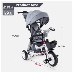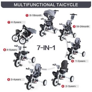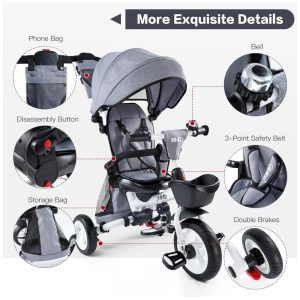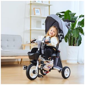 Triciclo Infantil Dobrável 7 em 1 com Alça Ajustável Arnês de Segurança Freios de Roda Capota Removível e Armazenamento JMMD Cinza