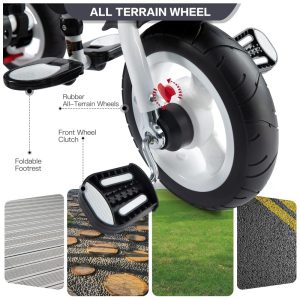 O arnês de segurança de 3 pontos e o guarda corpo de esponja removível oferecem segurança adicional para a criança. A almofada do assento de tecido oxford é removível e lavável, garantindo conforto ao bebê. O triciclo para bebês JMMD também possui vários locais de armazenamento, incluindo bolsa de armazenamento traseira, cesta frontal, bolso para telefone e porta copos.