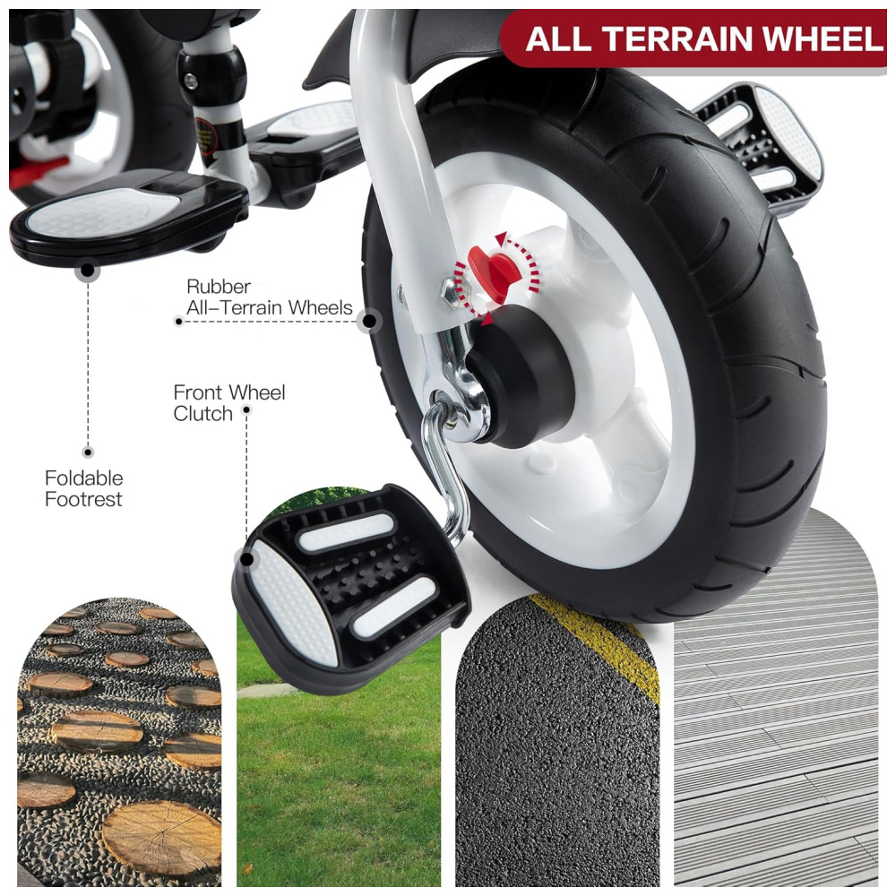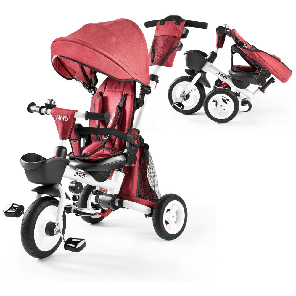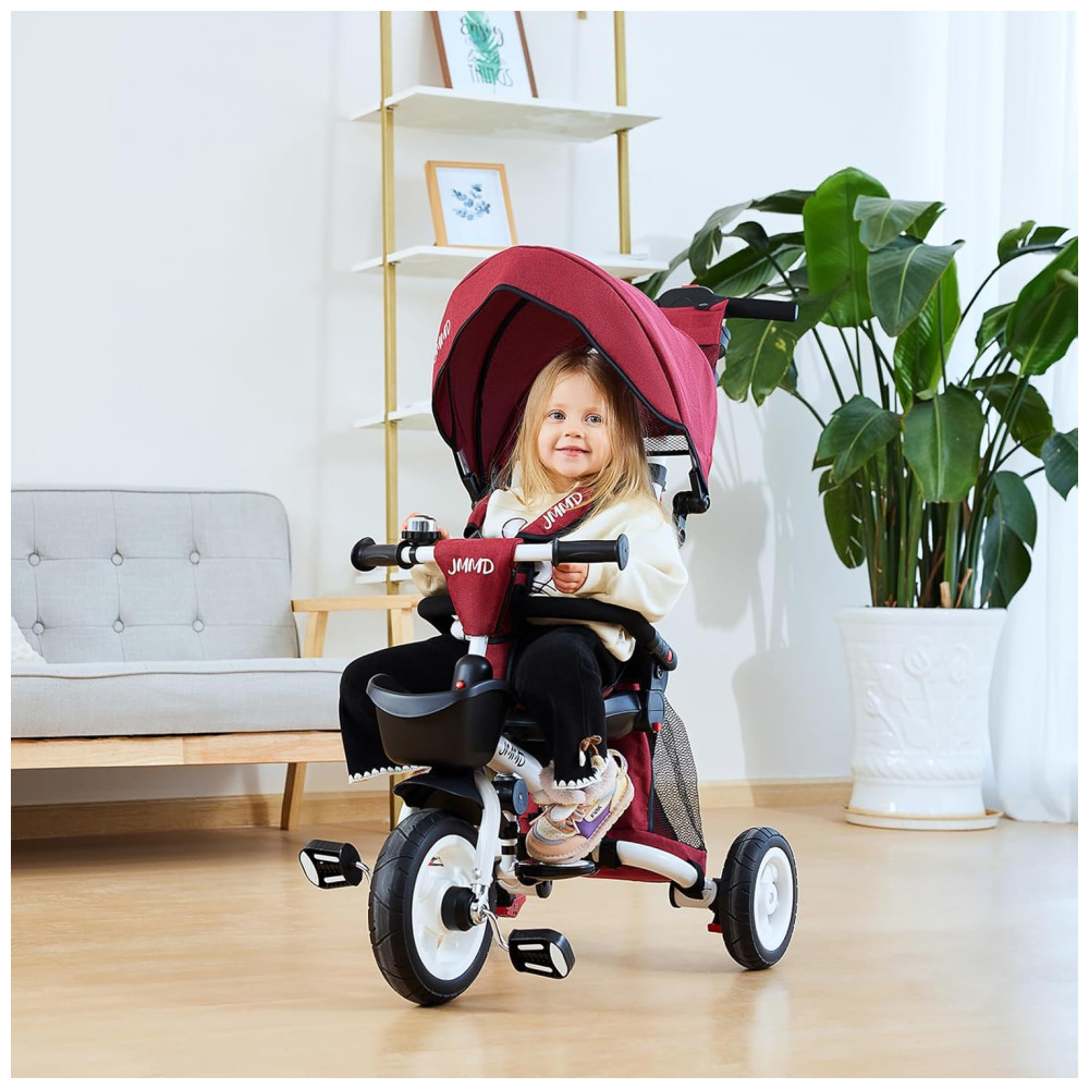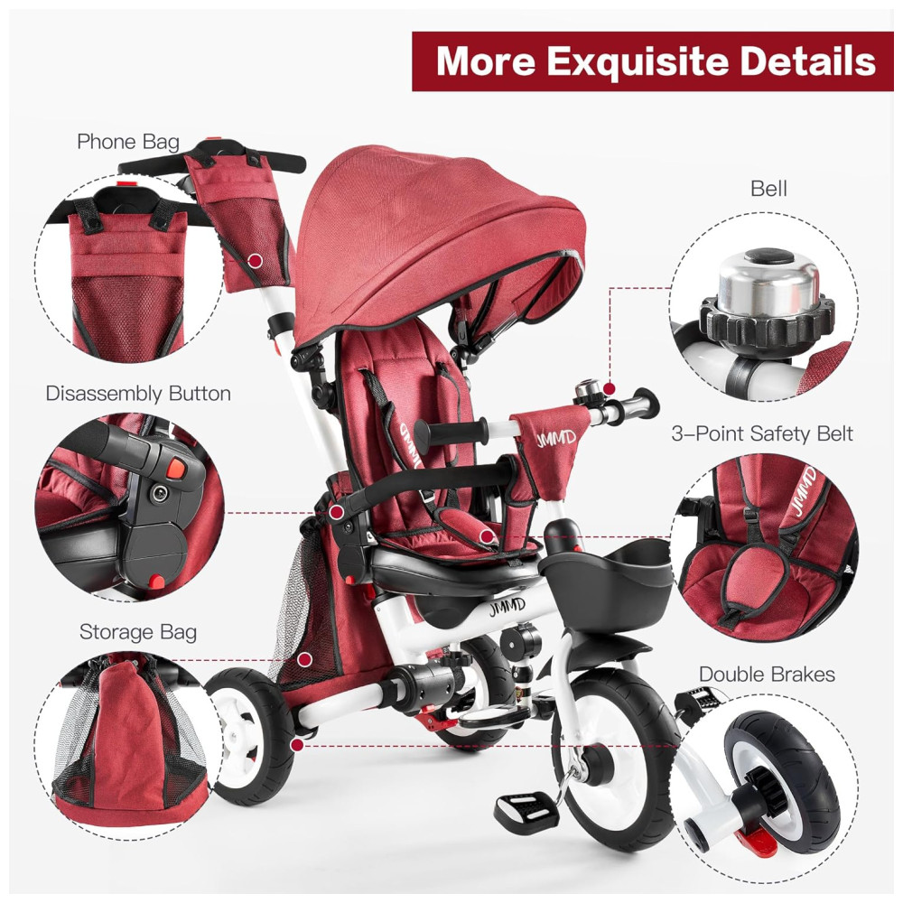 Triciclo Infantil Dobrável 7 em 1 com Alça Ajustável Arnês de Segurança Freios de Roda Capota Removível e Armazenamento JMMD Vermelho