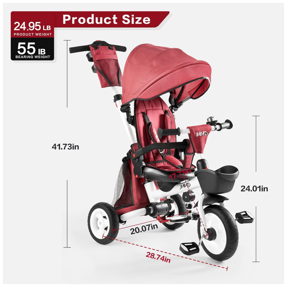 O triciclo JMMD é um produto versátil que pode atender às necessidades de crianças de diferentes idades, de 18 meses a 5 anos. Com seis modos de uso, este triciclo pode ser transformado em triciclo infantil, triciclo de direção, triciclo aprendido, triciclo clássico, assento giratório de 360 graus e modo dobrável. A dobragem rápida permite que o triciclo seja facilmente transportado no porta malas ou armazenado quando não estiver em uso.