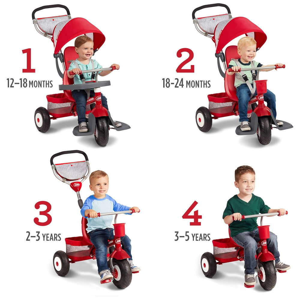 O Triciclo Carrinho de Bebê Radio Flyer Ultimate All-Terrain Stroll ‘N Trike Vermelho oferece 4 configurações evolutivas para adaptação gradual: triciclo para bebês (9-18 meses), triciclo com direção (18-24 meses), triciclo de aprendizado (2-3 anos) e triciclo clássico (4-5 anos), com conversão simples removendo acessórios. Equipado com pneus pneumáticos todo-terreno para rodagem suave em calçadas, trilhas e grama, estrutura em aço, plástico, tecido e borracha, e montagem requerida. Inclui dossel ajustável com proteção UV, bandeja envolvente, apoio para pés, cinto de segurança de 5 pontos, apoio de cabeça e bolsa para pais, além de guidão de empurrar ajustável em altura com empunhadura em espuma removível para controle parental.