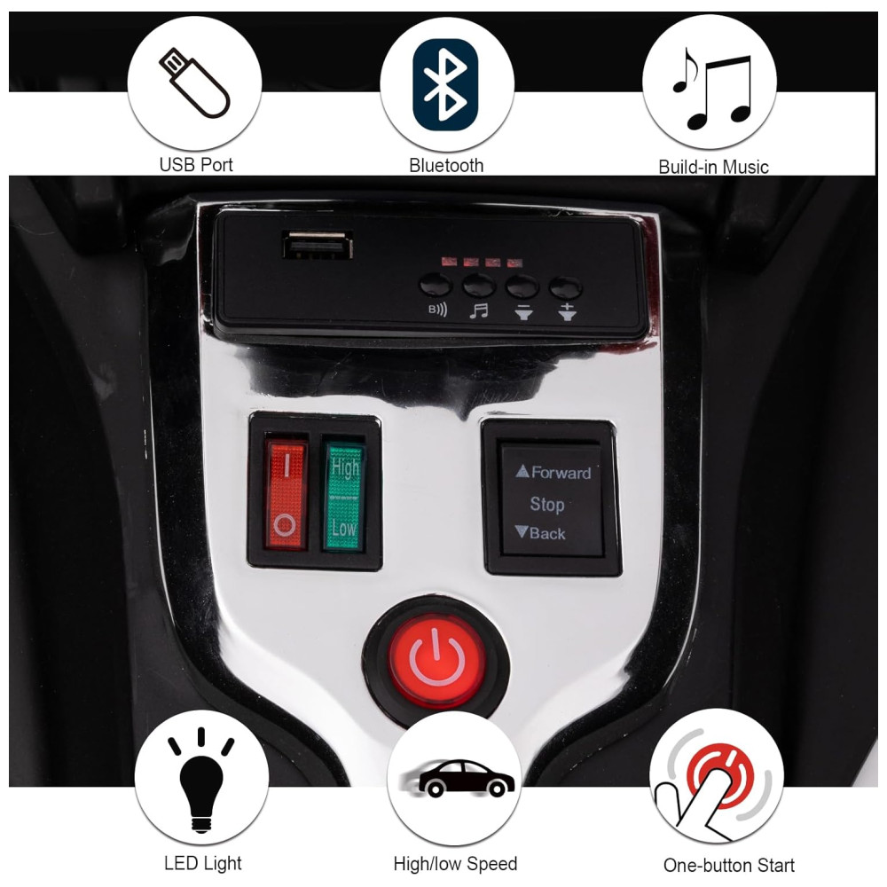 Este veículo elétrico infantil oferece diversão extra por meio de música integrada, MP3 player e porta USB para seus meninos e meninas. A função Bluetooth adicionará mais diversão à brincadeira, permitindo que seus filhos se divirtam enquanto desfrutam de suas músicas favoritas enquanto dirigem.