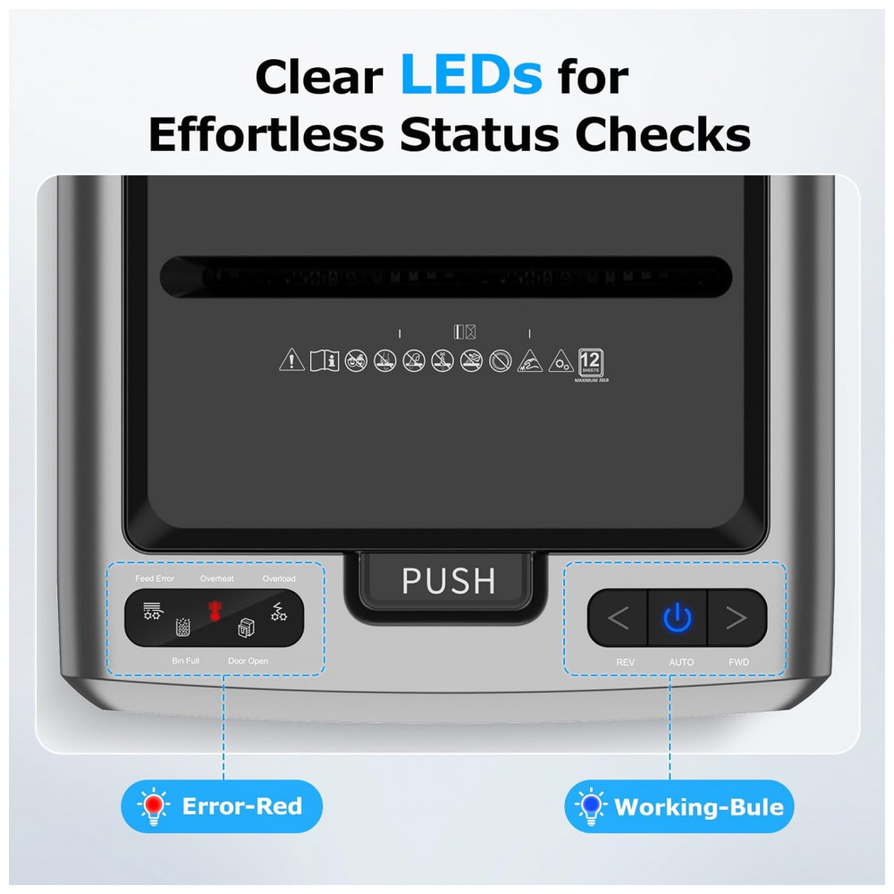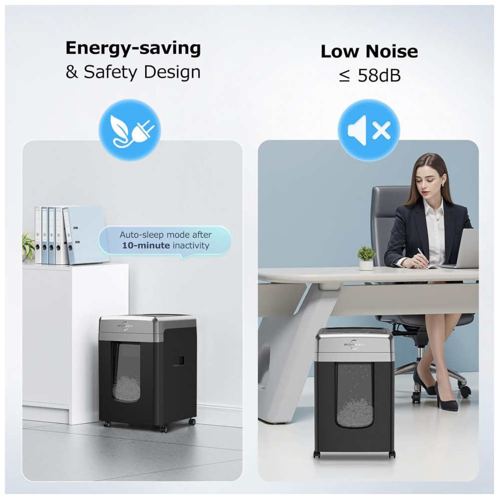 Com uma capacidade massiva de 300 folhas automático, o Triturador de Papel BONSEN permite triturar pilhas enormes de até 300 folhas automaticamente. Além disso, utilize a abertura manual para 12 folhas, grampos, cartões de crédito e CDs/DVDs com facilidade. Projetado para uso exigente em escritórios, oferecendo alta segurança com fragmentação microcorte que mede apenas 4 x 12 mm. Funciona em silêncio, com 58 dB, ideal para ambientes compartilhados. Conta com uma lixeira grande de 30,7 litros com modo de economia de energia automático após 10 minutos de inatividade. Móvel e fácil de transportar com rodízios.