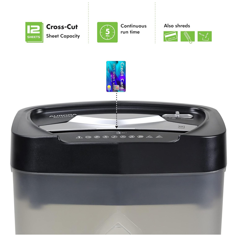 Corte transversal com capacidade para 12 folhas destrói cartões de crédito e pequenos clipes de papel.