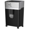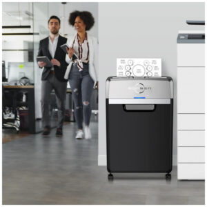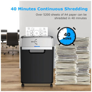 A fragmentadora de papel pesada da BONSEN tem capacidade para 24 folhas de papel tamanho carta (20 libras) de uma só vez. Além de papel, ela também destrói CDs, grampos, clipes, cartões de crédito e correspondências indesejadas para proteger suas informações sensíveis. Com nível de segurança P4, ela corta o papel em pedaços de 4 x 35 mm, atendendo aos padrões de segurança. Possui um cesto removível de 34 litros que pode conter até 650 folhas de papel, reduzindo a frequência de esvaziamento. Com um tempo de funcionamento contínuo de 40 minutos, a fragmentadora pode destruir até 5230 folhas em um único ciclo. Operação silenciosa com 55 dB, permitindo um ambiente tranquilo de trabalho. Equipada com proteção contra travamentos, botões de controle e luzes indicadoras de funcionamento para uma utilização segura e fácil.