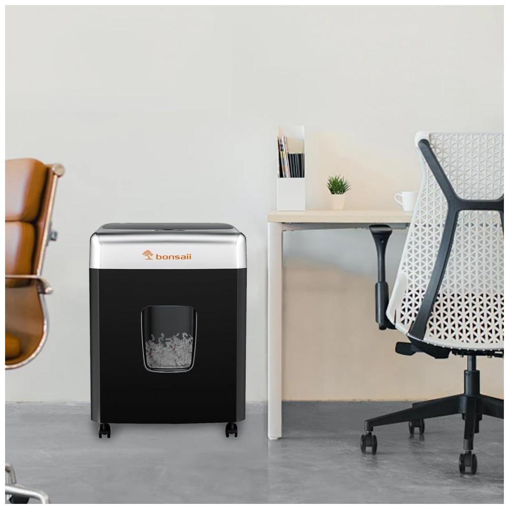 A Trituradora de Papel Bonsaii é perfeita para uso doméstico e profissional, oferecendo capacidade de triturar automaticamente até 110 folhas e manualmente até 12 folhas, incluindo correspondências, cartões e grampos. Com modo contínuo de 30 minutos de operação, a fragmentação microcorte de nível de segurança P4 garante privacidade, transformando o papel em partículas de 4mm x 12mm. O amplo cesto de 23 litros reduz a frequência de esvaziamento, com mobilidade facilitada por rodízios de 360 graus. Uma forma eficiente e segura de manter suas informações protegidas.