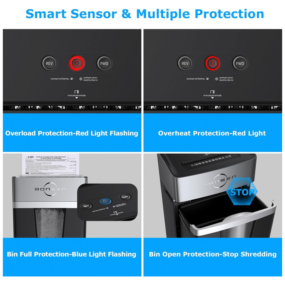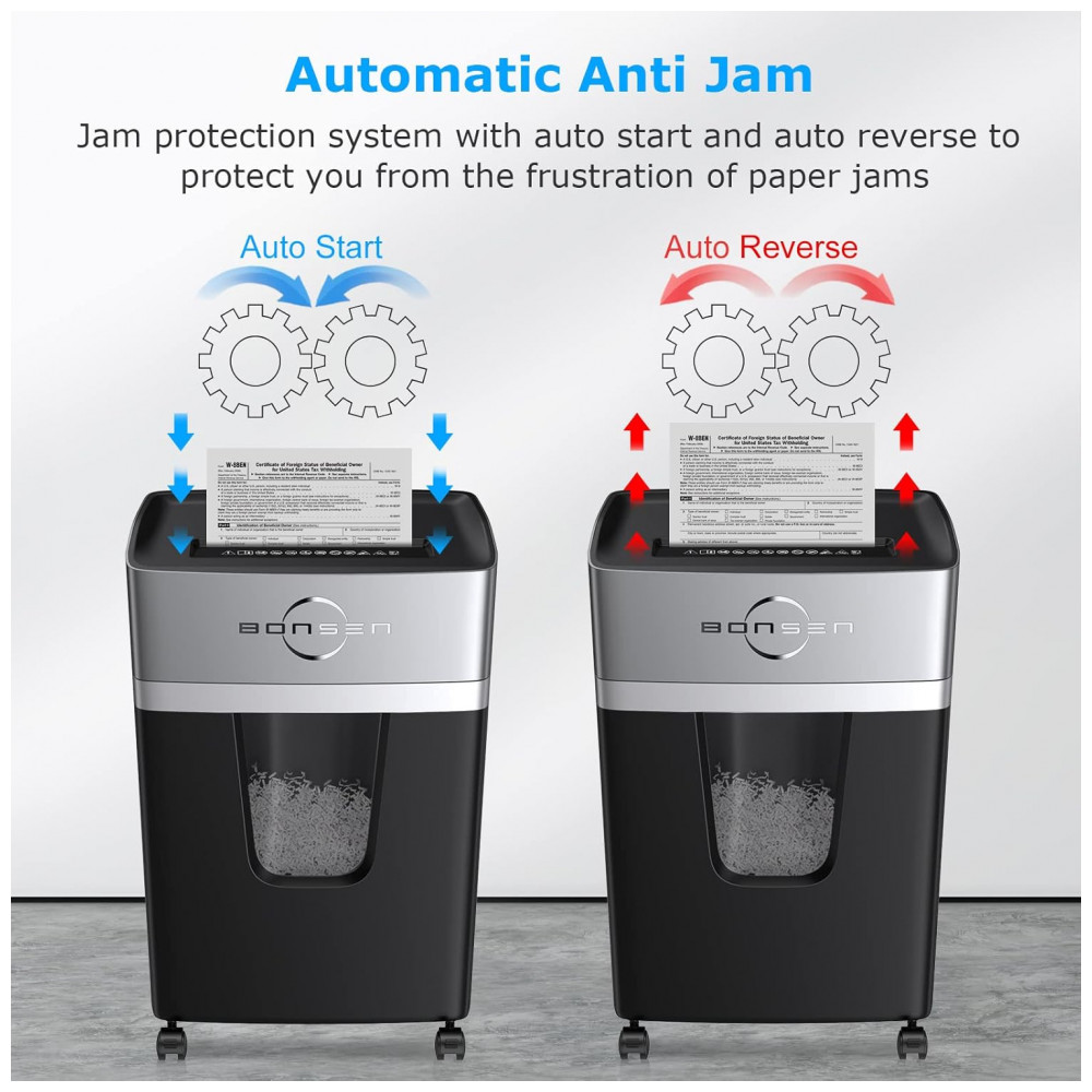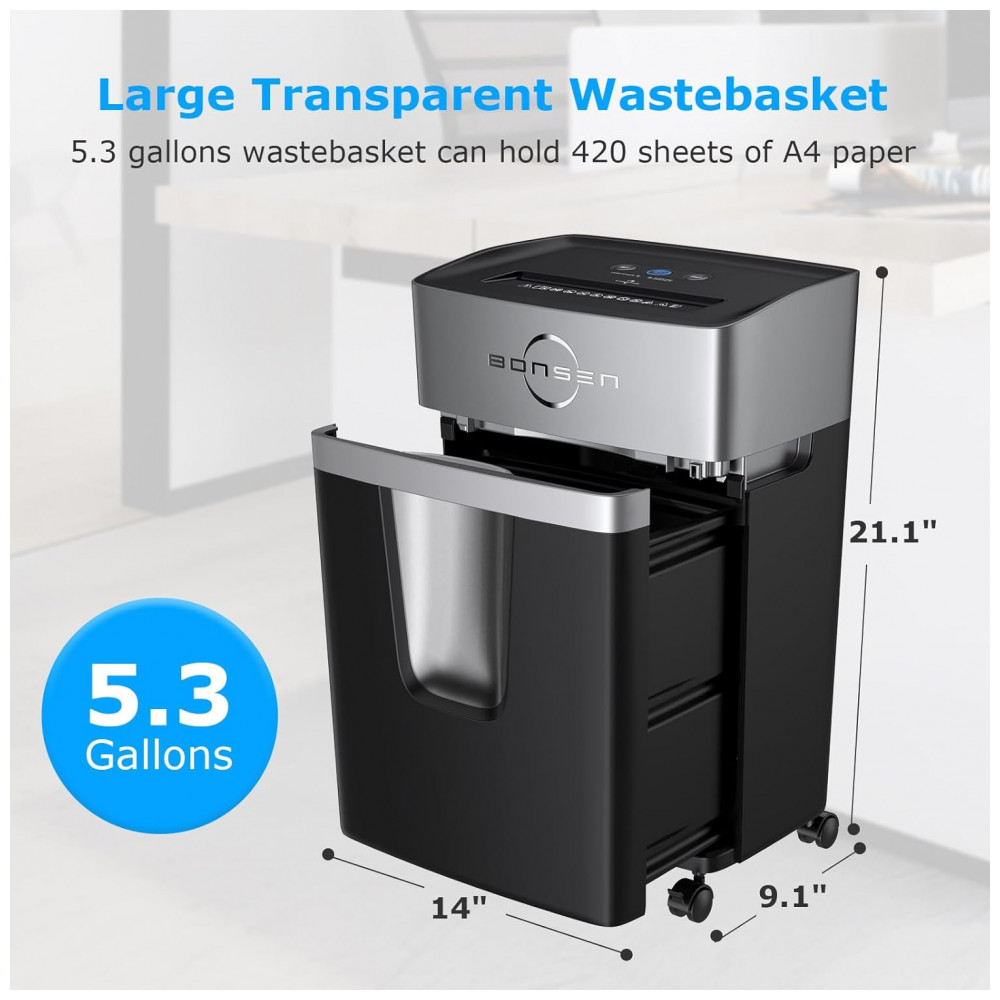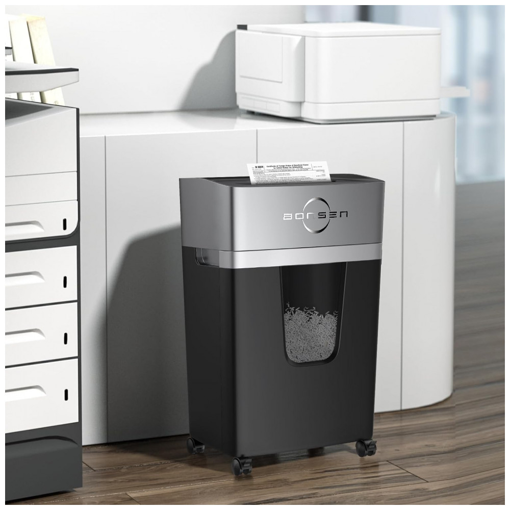 A Trituradora de Papel Micro Cut da BONSEN pode triturar até 12 folhas por vez em pequenos pedaços de 3×5 mm, além de CDs, cartões de crédito, grampos e correspondências. Ideal para uso em casa ou escritório, possui tempo de funcionamento de 40 minutos e operação ultra silenciosa de 55 dB, graças ao seu sistema patenteado de resfriamento. A função antiatolamento e reversão automática evitam obstruções, garantindo uso contínuo. Com design amigável ao usuário, possui botões convenientes e indicadores LED para facilitar o uso e manutenção. Seu cesto removível de 20 litros permite maior capacidade de armazenamento, enquanto sua construção resistente garante durabilidade. A Trituradora de Papel Micro Cut da BONSEN é a escolha perfeita para quem busca eficiência, segurança e tranquilidade em suas tarefas diárias.