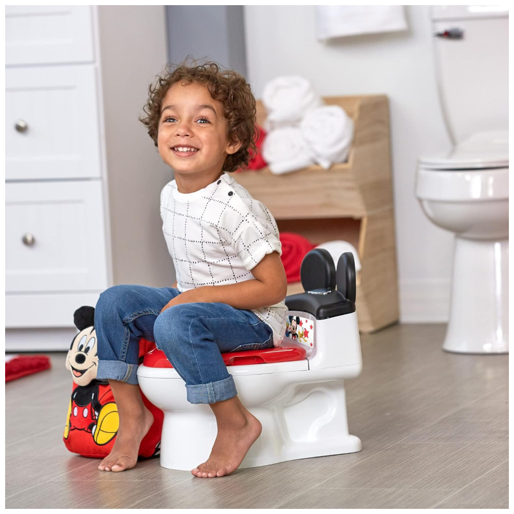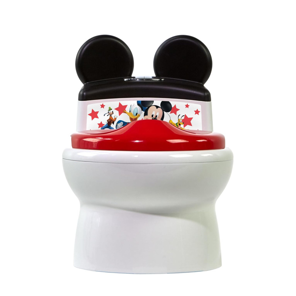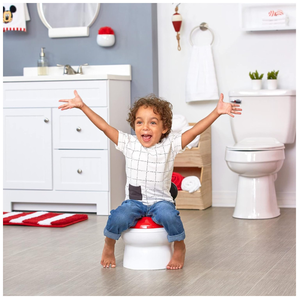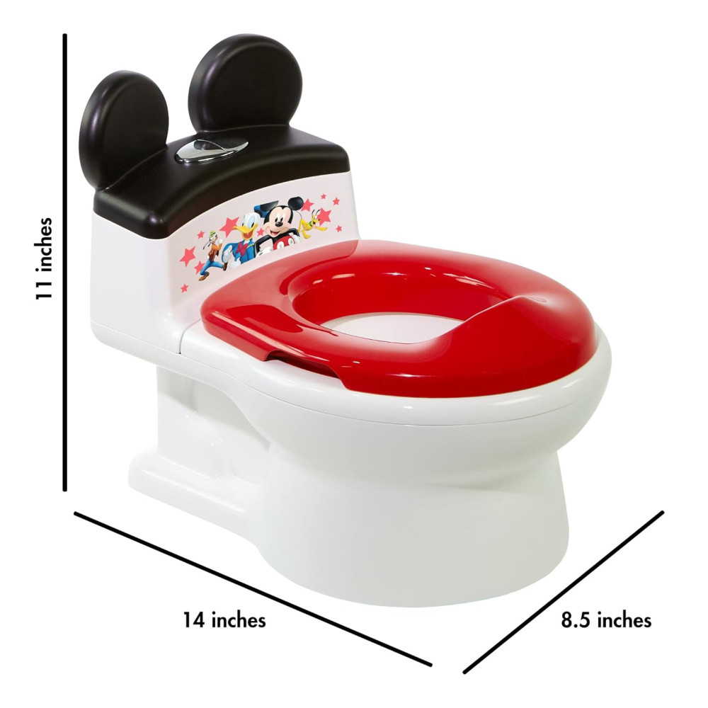 POTTY TRAINER SEAT O sistema de treinamento potty inclui um penico de treinamento que apresenta personagens da Disney e um assento de treinador com proteção contra respingos para uma transição suave para o banheiro da família