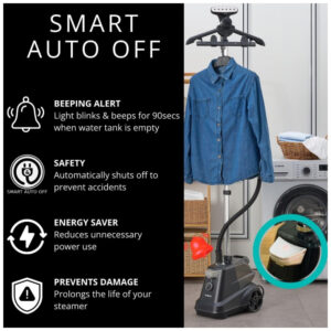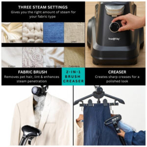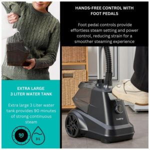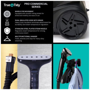 Apresentamos o Vaporizador de Roupas Industrial Pesado da True Tidy, com tecnologia avançada a vapor e potência de 1800 watts para uso residencial e comercial. Seu reservatório de água de 3 litros oferece até 1,5 horas de vapor contínuo, controlado de forma conveniente por um pedal. Possui mangueira duplamente isolada com conector de latão, bico de vapor durável revestido de alumínio e três configurações de vapor para diferentes tecidos. O cabide giratório de 360 graus com presilhas pode acomodar até seis peças de roupa ao mesmo tempo. PROJETADO PARA FACILIDADE EM AMBIENTES COMERCIAIS E RESIDENCIAIS. Fabricado para garantir utilização sem esforço em ambientes comerciais e residenciais. DESEMPENHO DURÁVEL. Com um reservatório removível de 3 litros, oferece vapor contínuo por mais de 90 minutos sem interrupções. CONVENIÊNCIA SEM ESFORÇO. Alcance roupas, cortinas e estofados sem rugas facilmente, pendurando com segurança uma variedade de peças com o versátil e seguro cabide multifuncional. MOBILIDADE E ARMAZENAMENTO CONVENIENTE. Com rodas para movimentação fácil, a barra de suporte telescópica de alumínio se retrai convenientemente para armazenamento compacto. VAPOR DE ALTO DESEMPENHO. Com uma impressionante saída de vapor de 1800 watts, é a escolha preferida para eliminar rugas de vários tipos de tecido sem esforço.